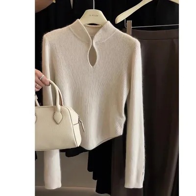新中式不规则立领镂空内搭打底衫女春秋冬修身羊绒毛衣针织衫上衣