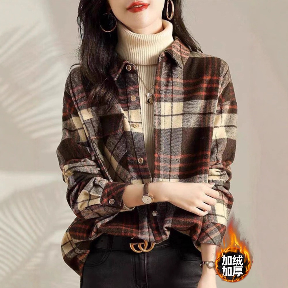 新款时尚休闲加绒加厚翻领格子衬衫宽松显瘦气质百搭长袖外套上衣
