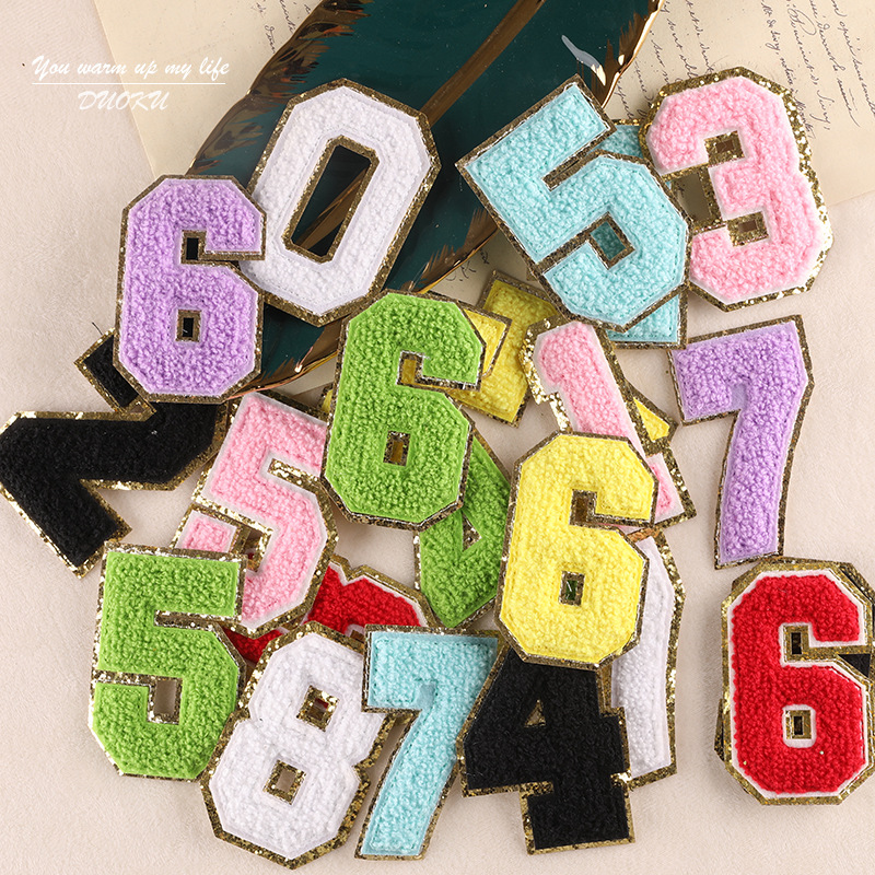 カラフルなアラビア数字英語文字スパンコールパッチビーズ反射布パッチグリットグリッター刺繍パッチ