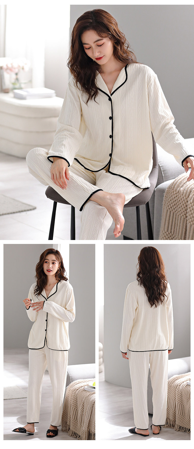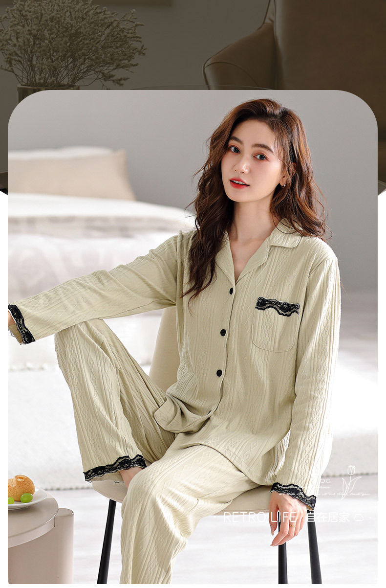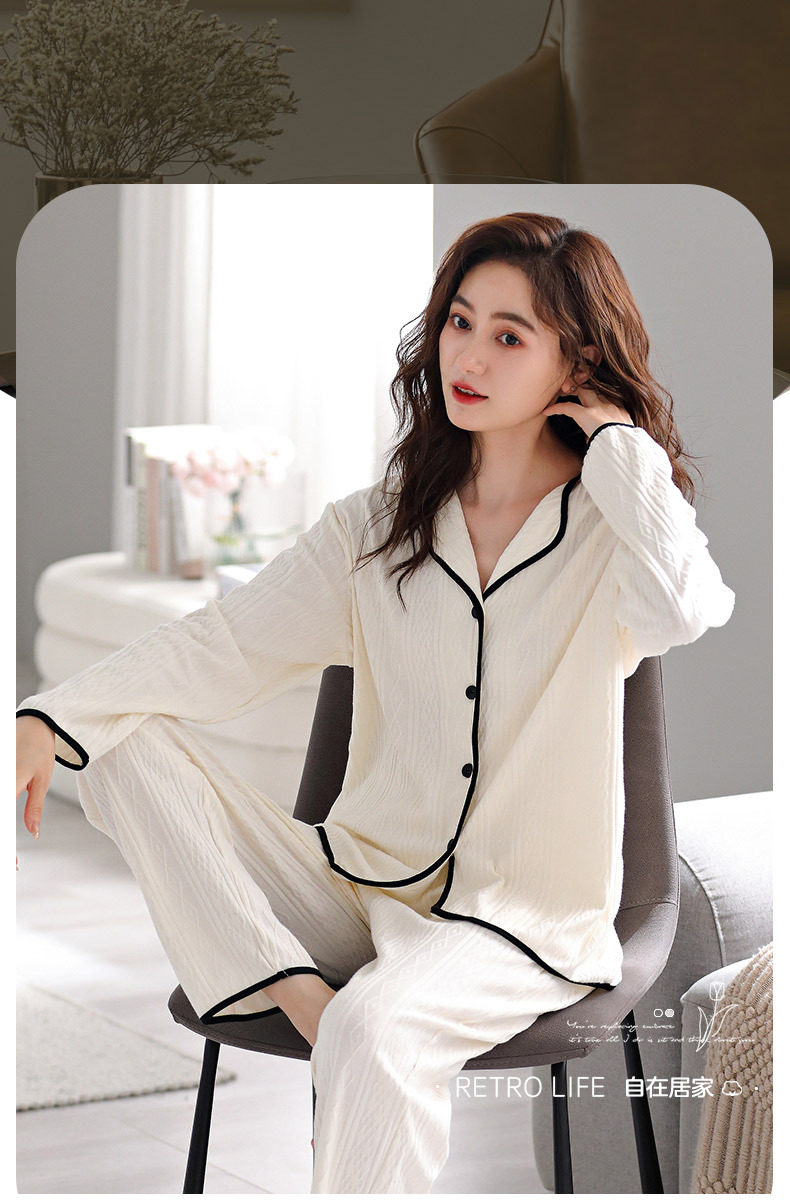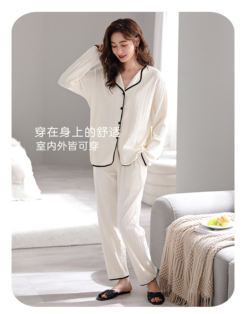 パジャマレディース春秋タイプ純綿薄手長袖春夏vネックホワイト名媛風高級感ホームウェアセット