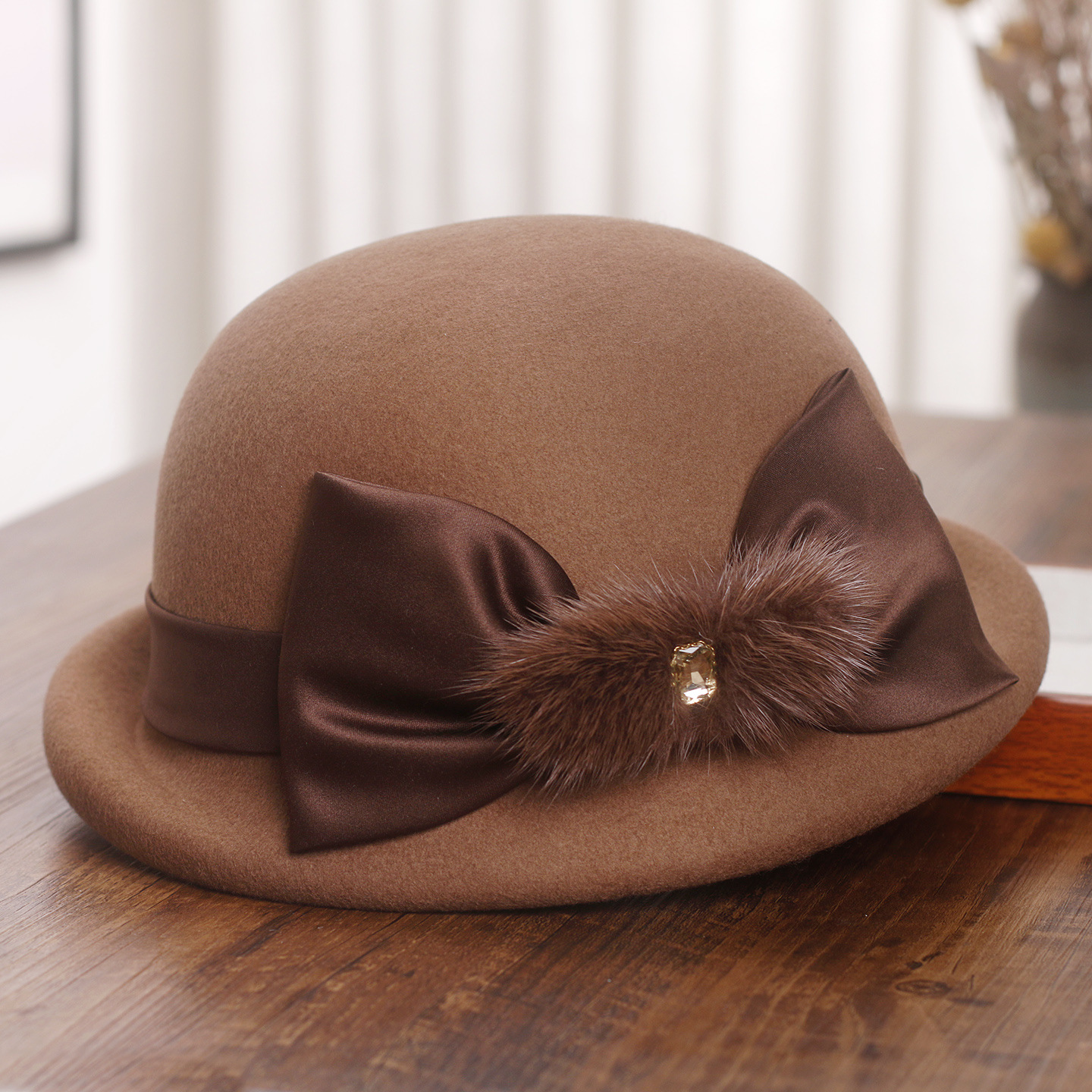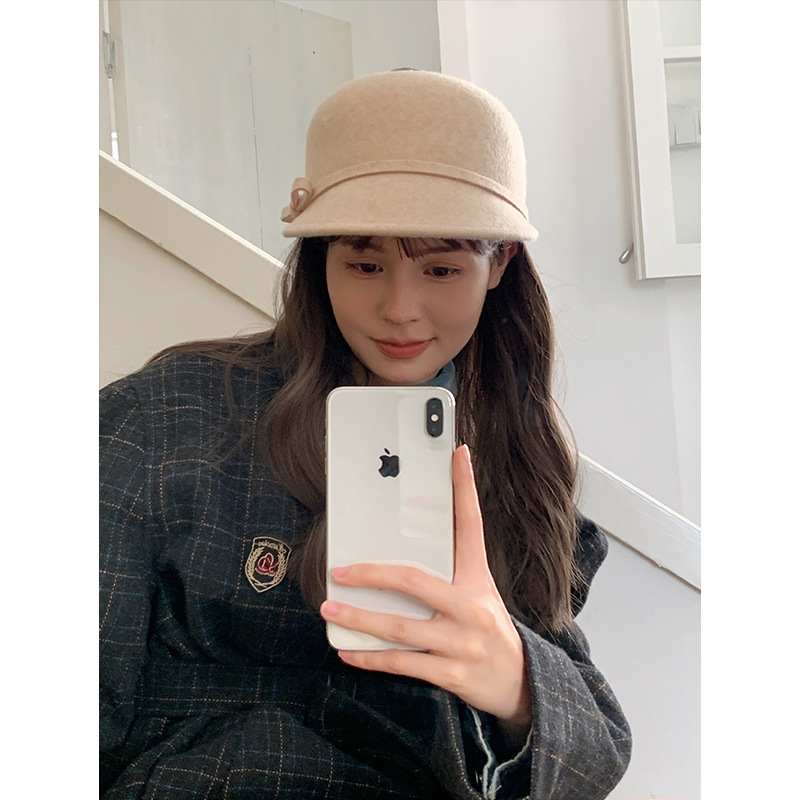 赫本風綿毛蝶結びの縁巻き帽子女性秋冬高級感四角い顔が顔を見せています。