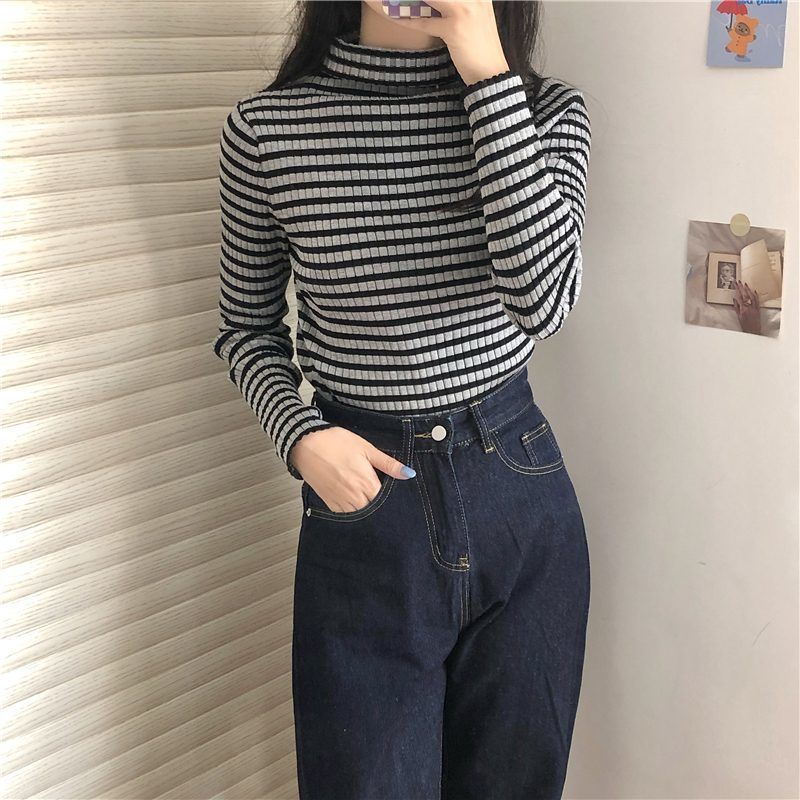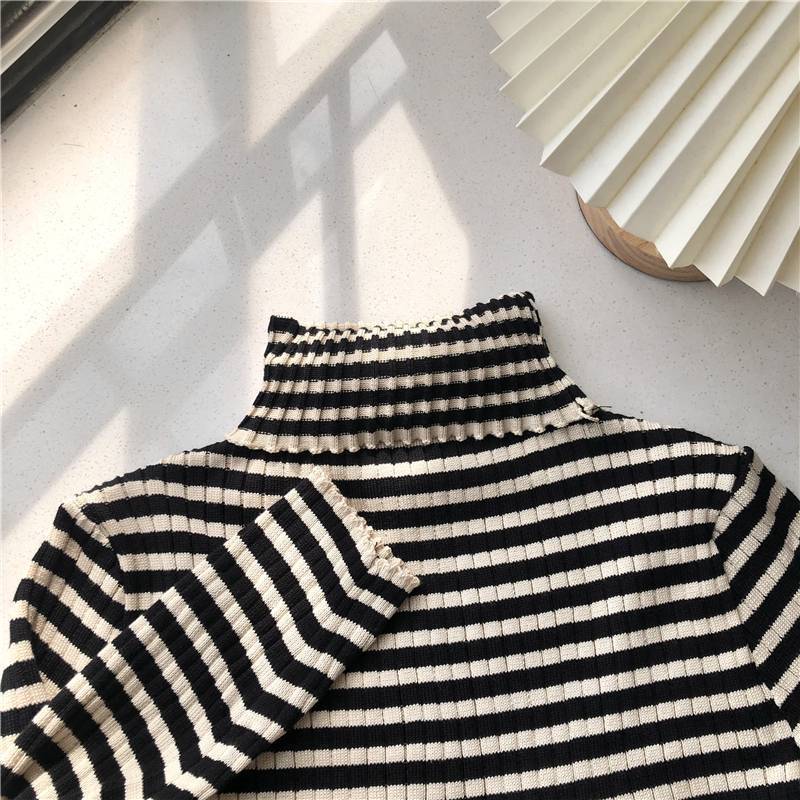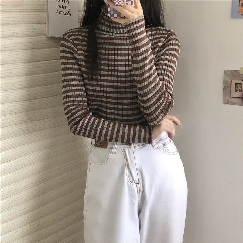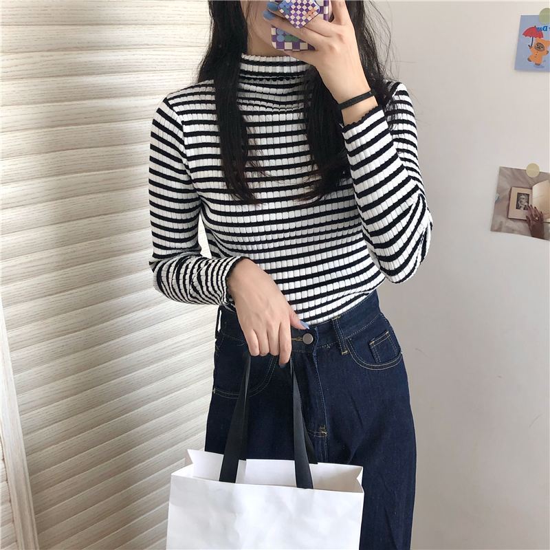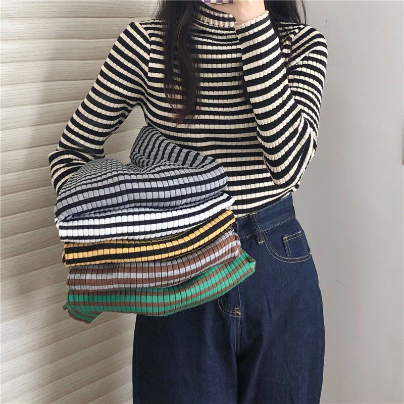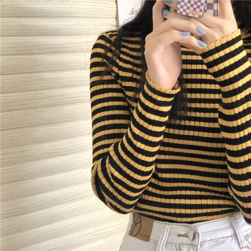 2023秋冬の底のシャツの新型の長袖のストライプのセーターの女性の高襟の修身の中で色の半高襟のニットの服を合わせます。