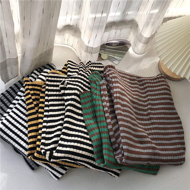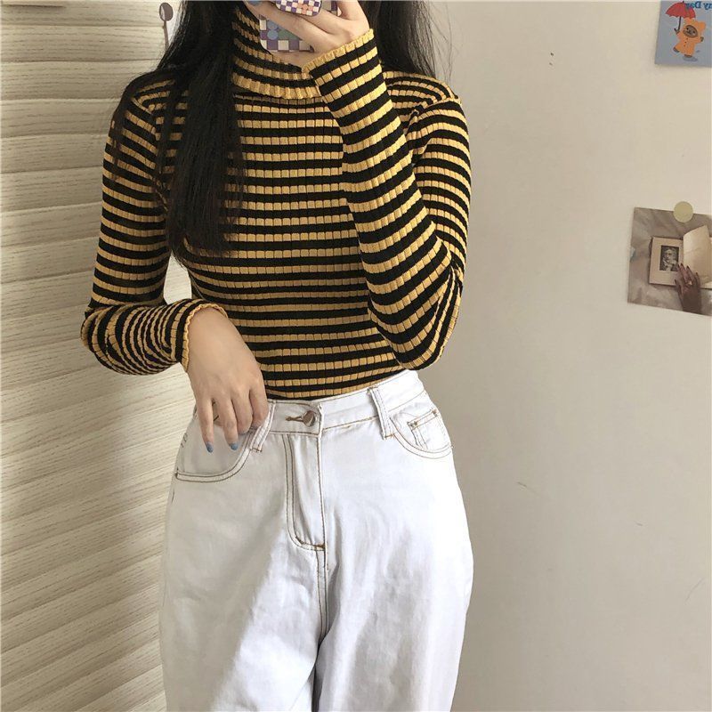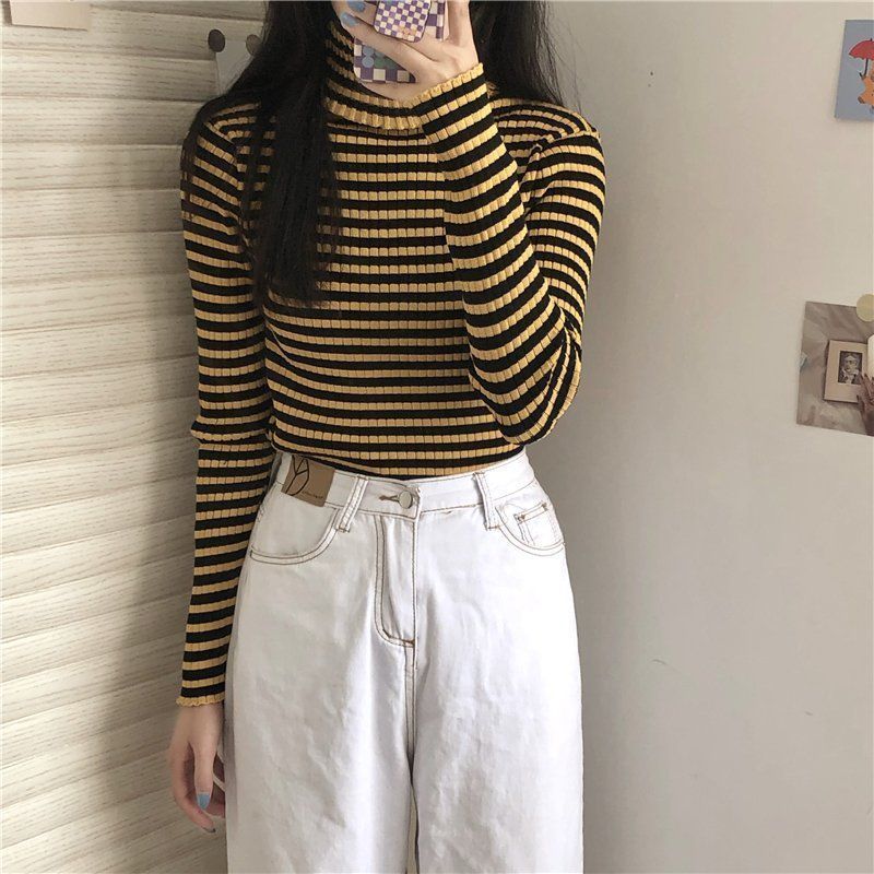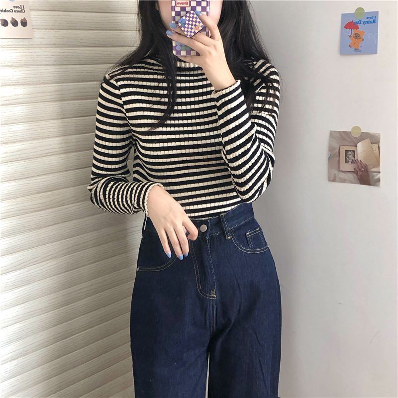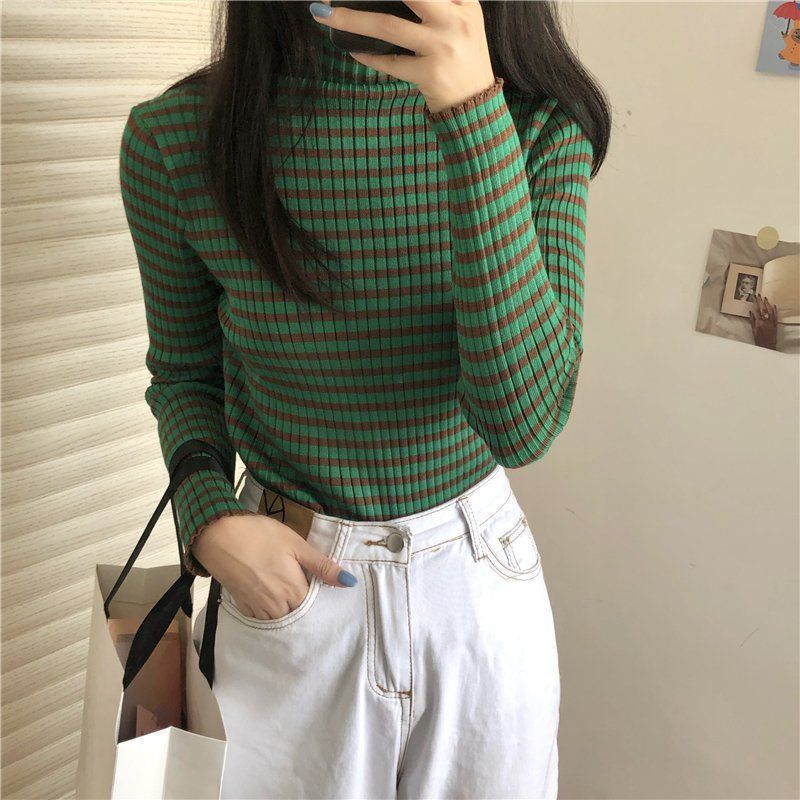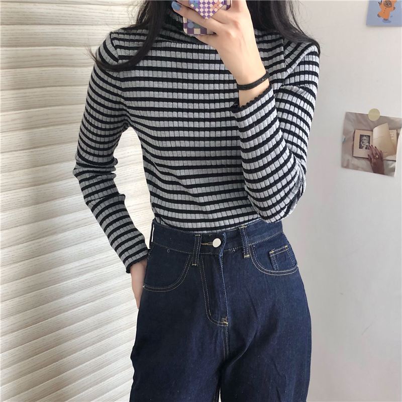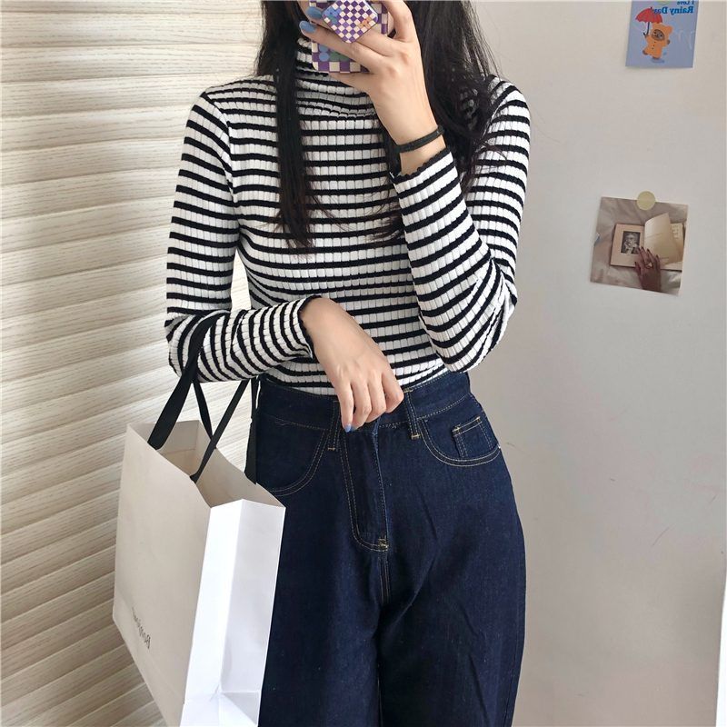 2023秋冬の底のシャツの新型の長袖のストライプのセーターの女性の高襟の修身の中で色の半高襟のニットの服を合わせます。