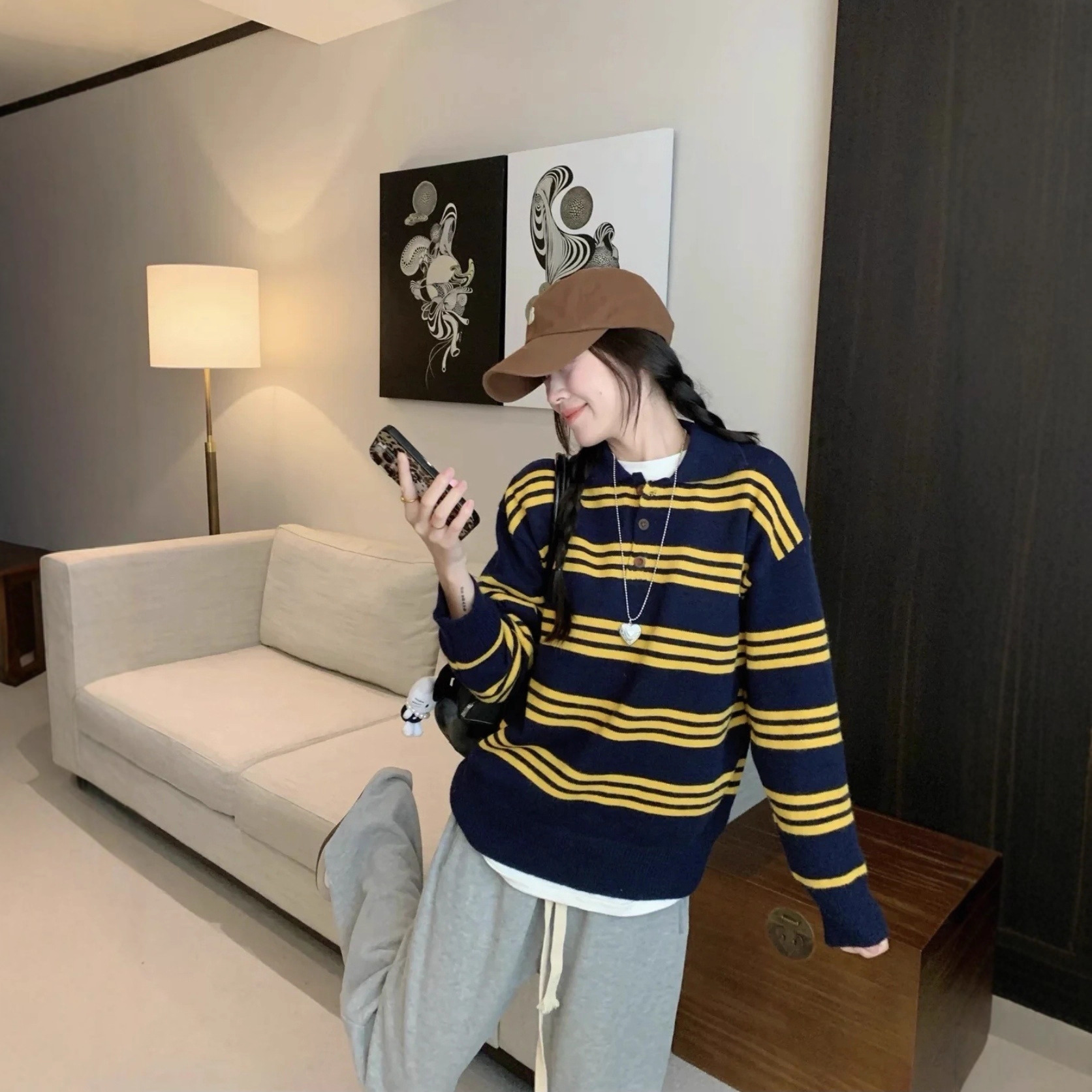レトロなストライプの丸首のセーターの女性の底のシャツの秋冬の中は厚くてゆったりしています。