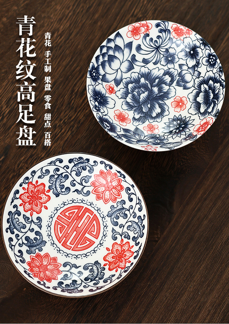 青花中国式高脚陶磁器果盤仏前寺院功盤家庭用間食菓子客間乾果茶点盤