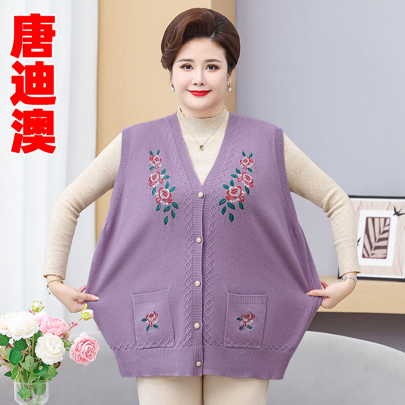 お母さんは春と秋の丸首の刺繍のニットのカーディガンの中で年配の女性の薄い長袖のゆったりしている大きいサイズのセーターのコートを詰めます。