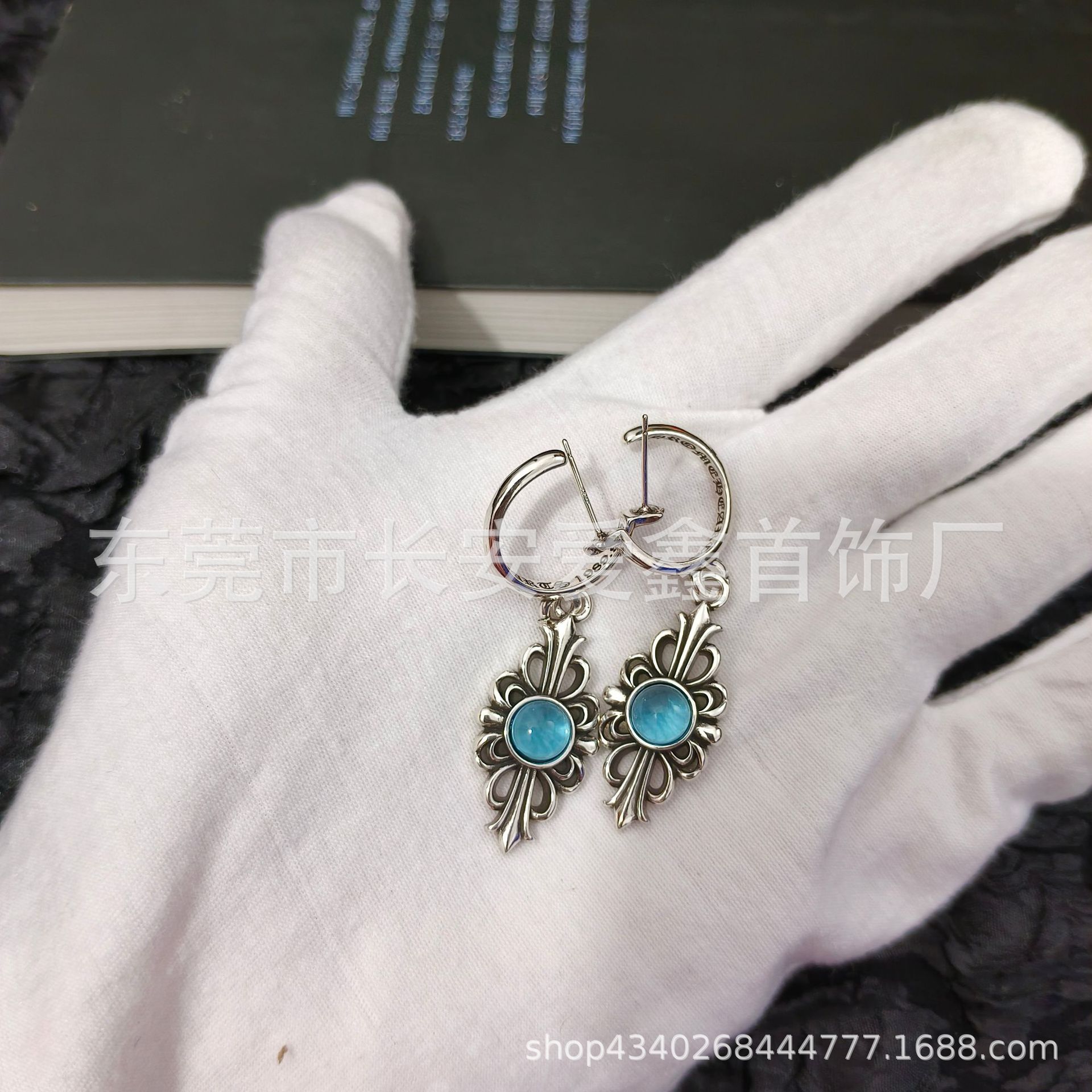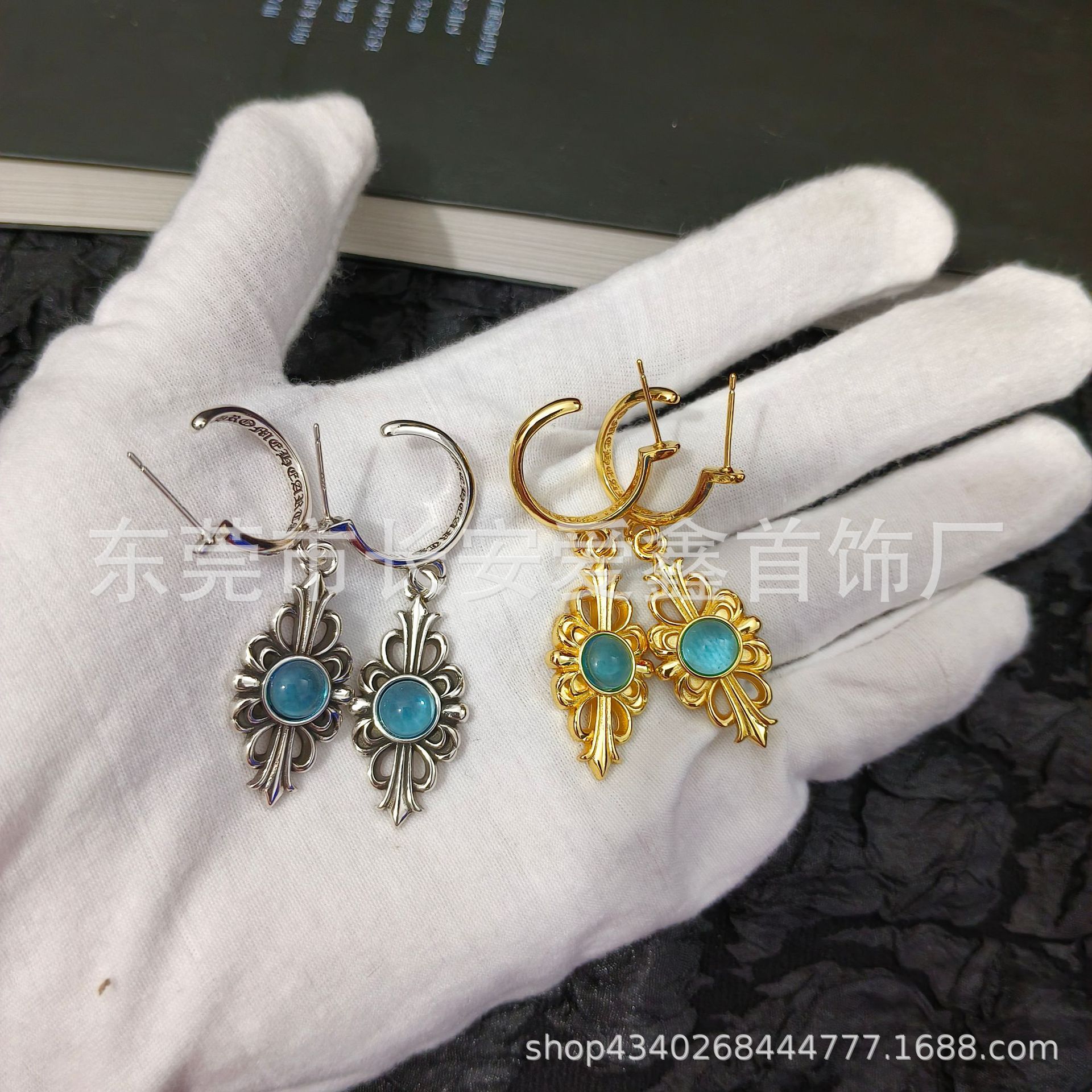 クロは古いレトロな十字の花の猫の目の石のイヤリングをします。