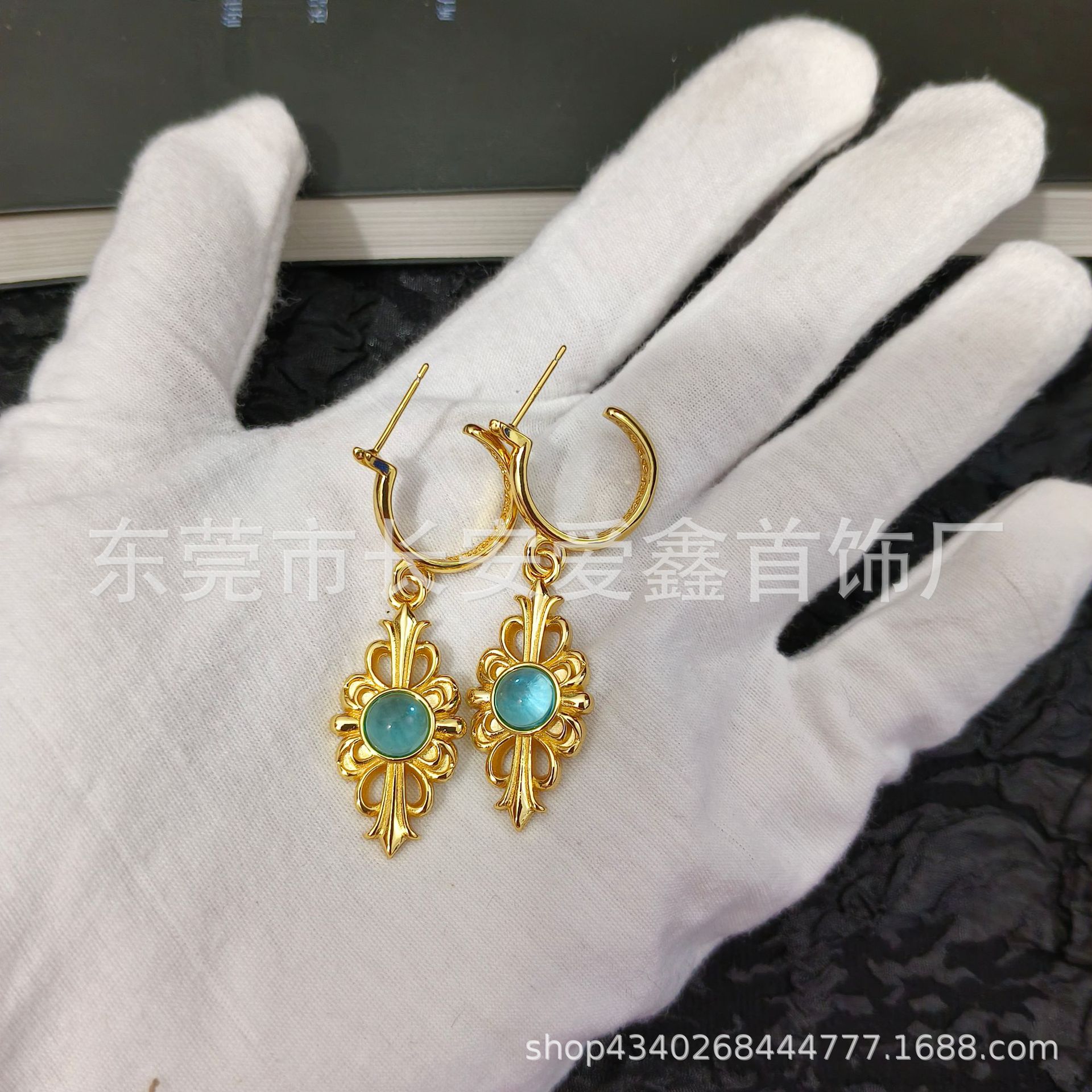 カラー レトロ十字猫眼石イヤリング,金色の十字花猫眼石イヤリング