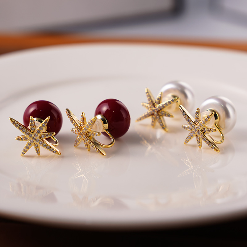 高級感の軽い豪華なジルコンの八芒星の前後の真珠のイヤリングの女性の耳の穴の一体の耳のクリップの気質の名媛の耳飾り