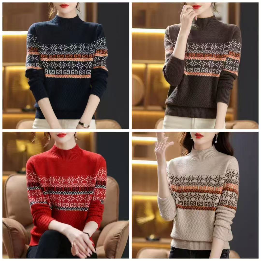 羊绒半高领针织衫毛衣女装新款撞色提花宽松洋气打底内搭时尚休闲