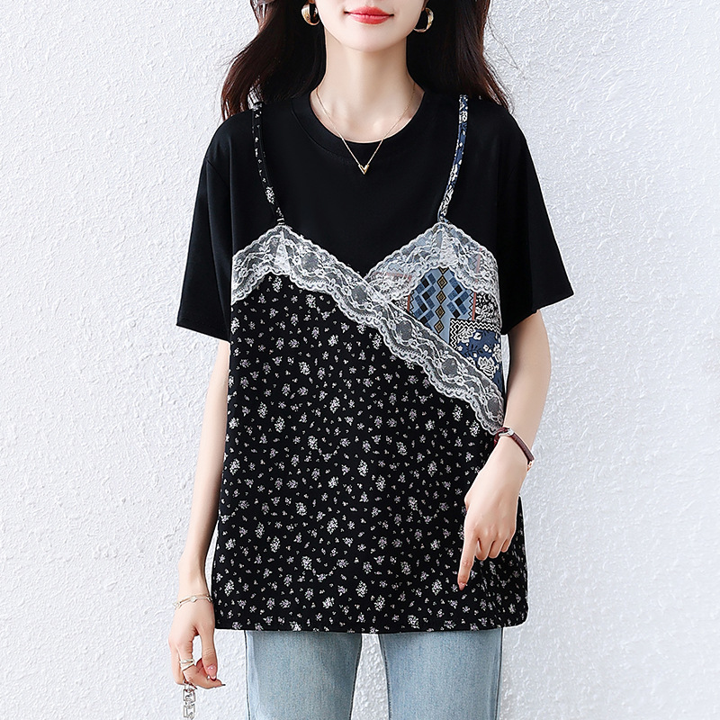 実物写真夏新作花柄レースサスペンダーフェイクツーピース半袖シャツ大きいサイズルーズトップ