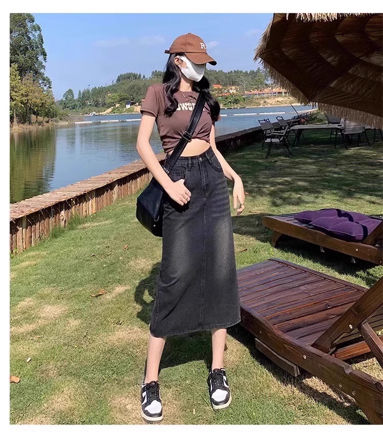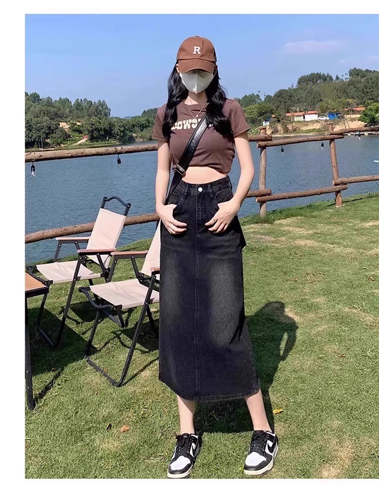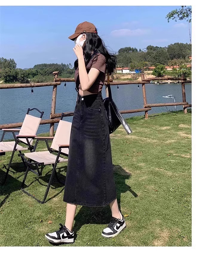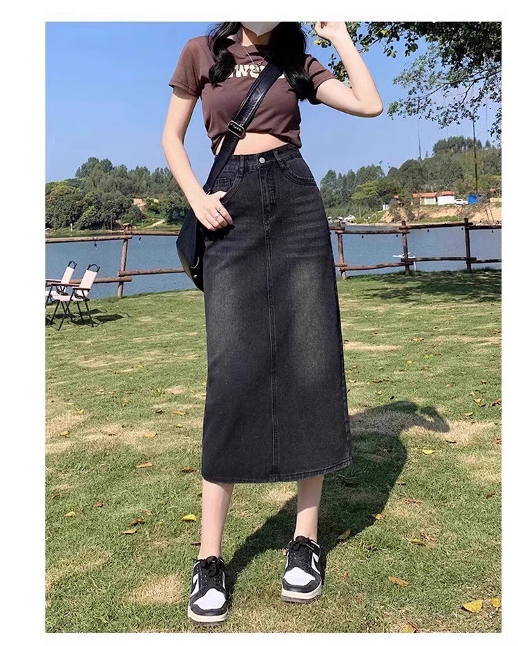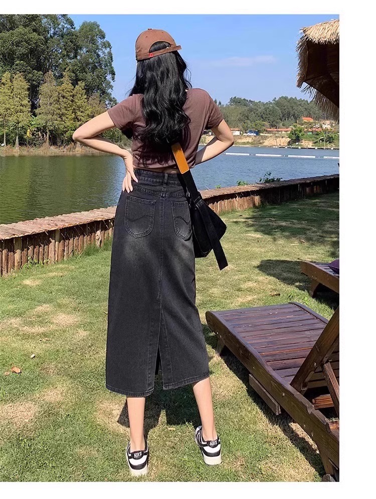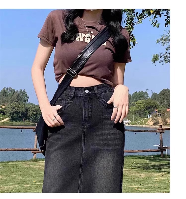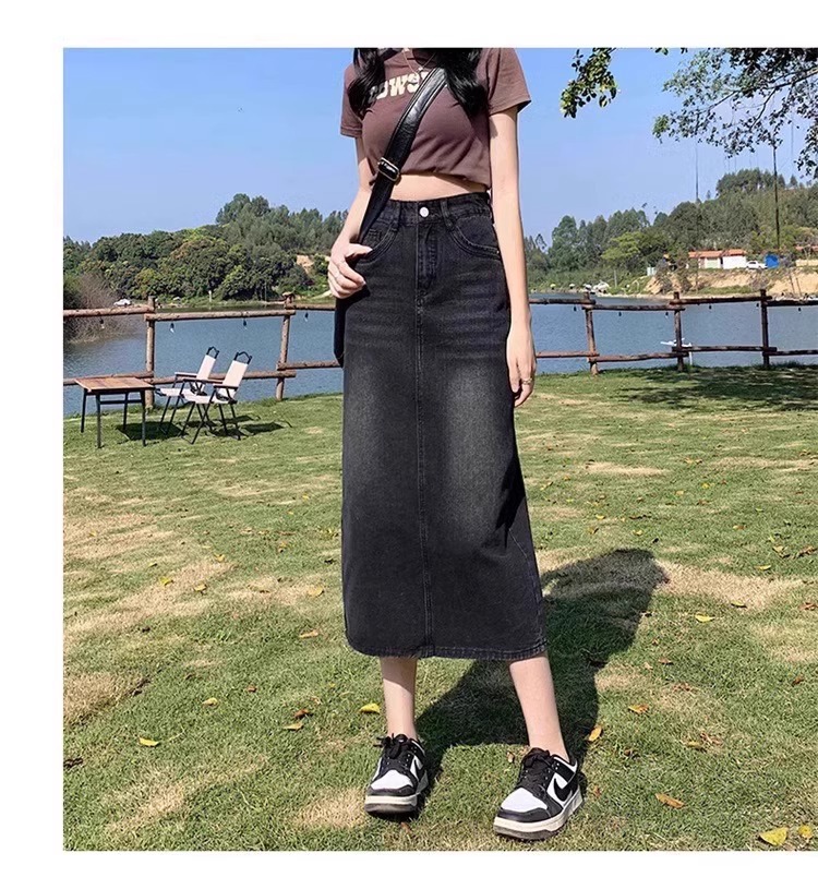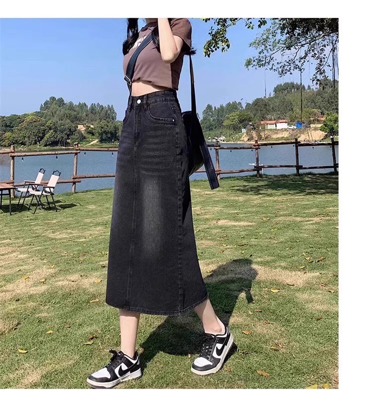 大きいサイズの黒灰色のデニムの半身のスカートの女性の新型のナシの形の体つきは股を遮って見えます。