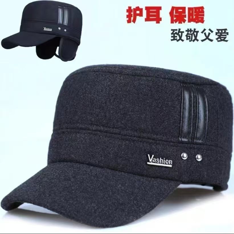 中老年人帽子男冬天加厚保暖毛呢平顶帽护耳爷爷爸爸老头棒球棉帽