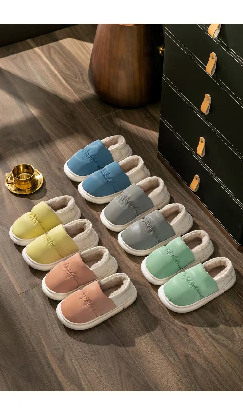 綿のスリッパの女性の冬のpu皮の家庭の保温の滑り止めの防水の新型のファッションの家のカップルの毛のスリッパの男性の卸売り