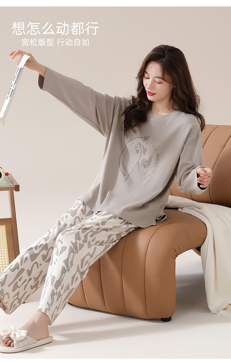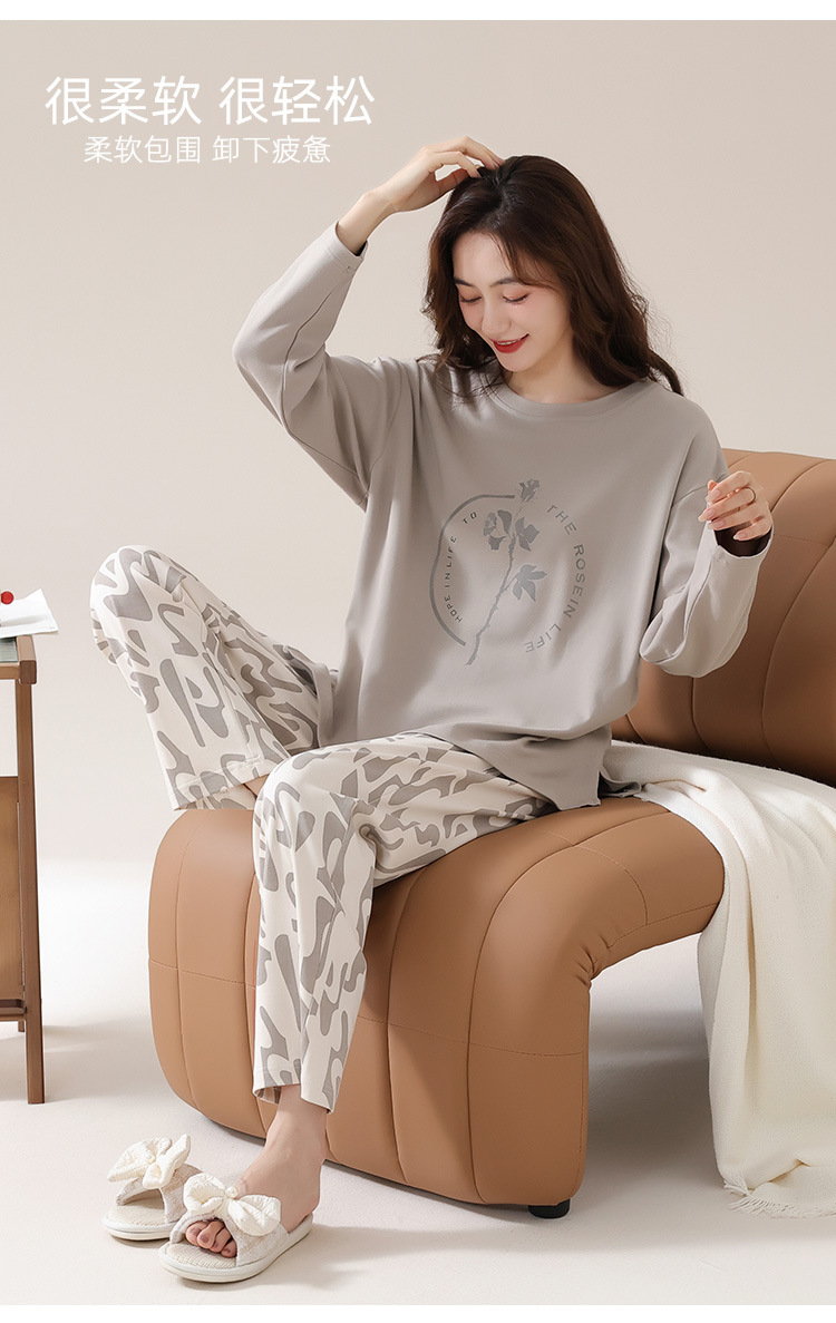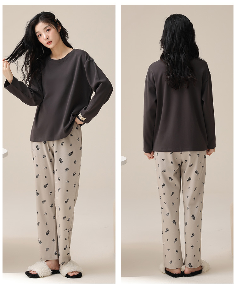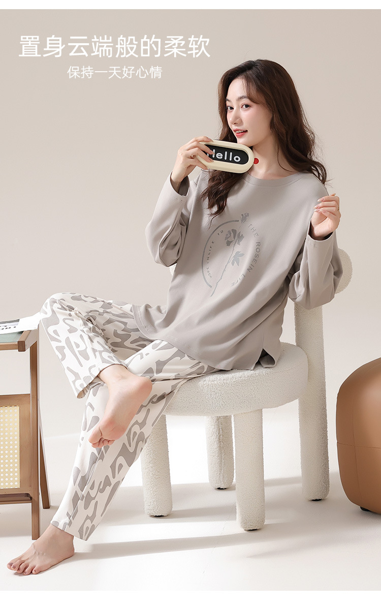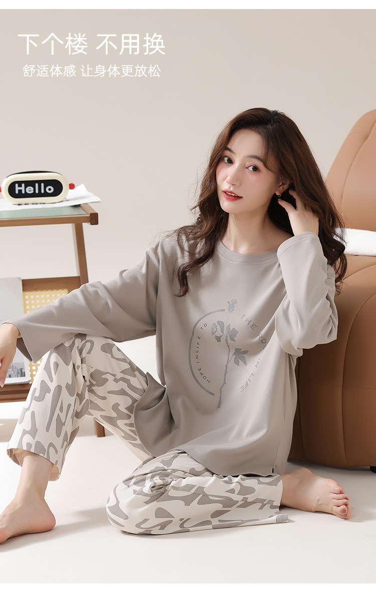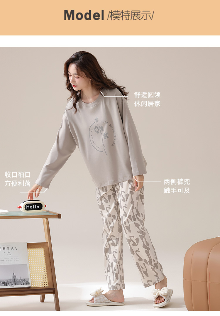 純綿パジャマ女性秋の新型丸首の長袖は秋冬の厚手の純綿の家庭服セットを外に着ることができます。