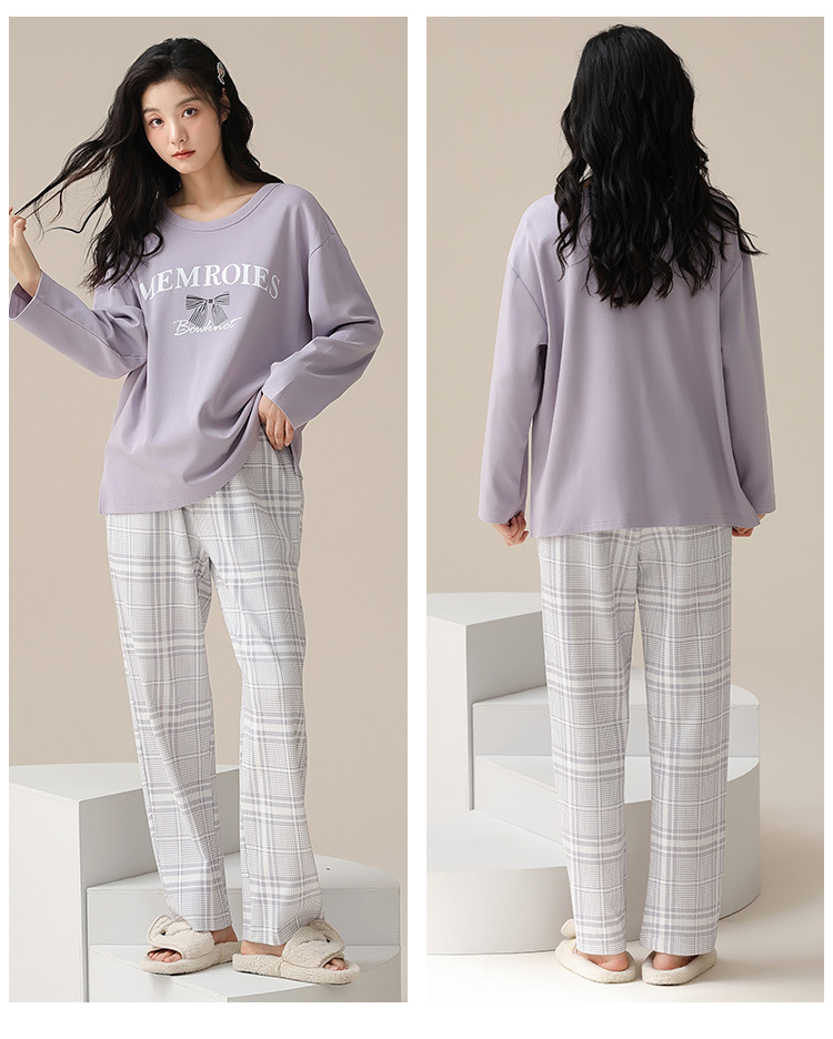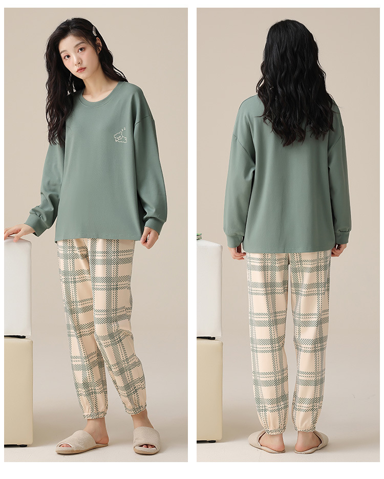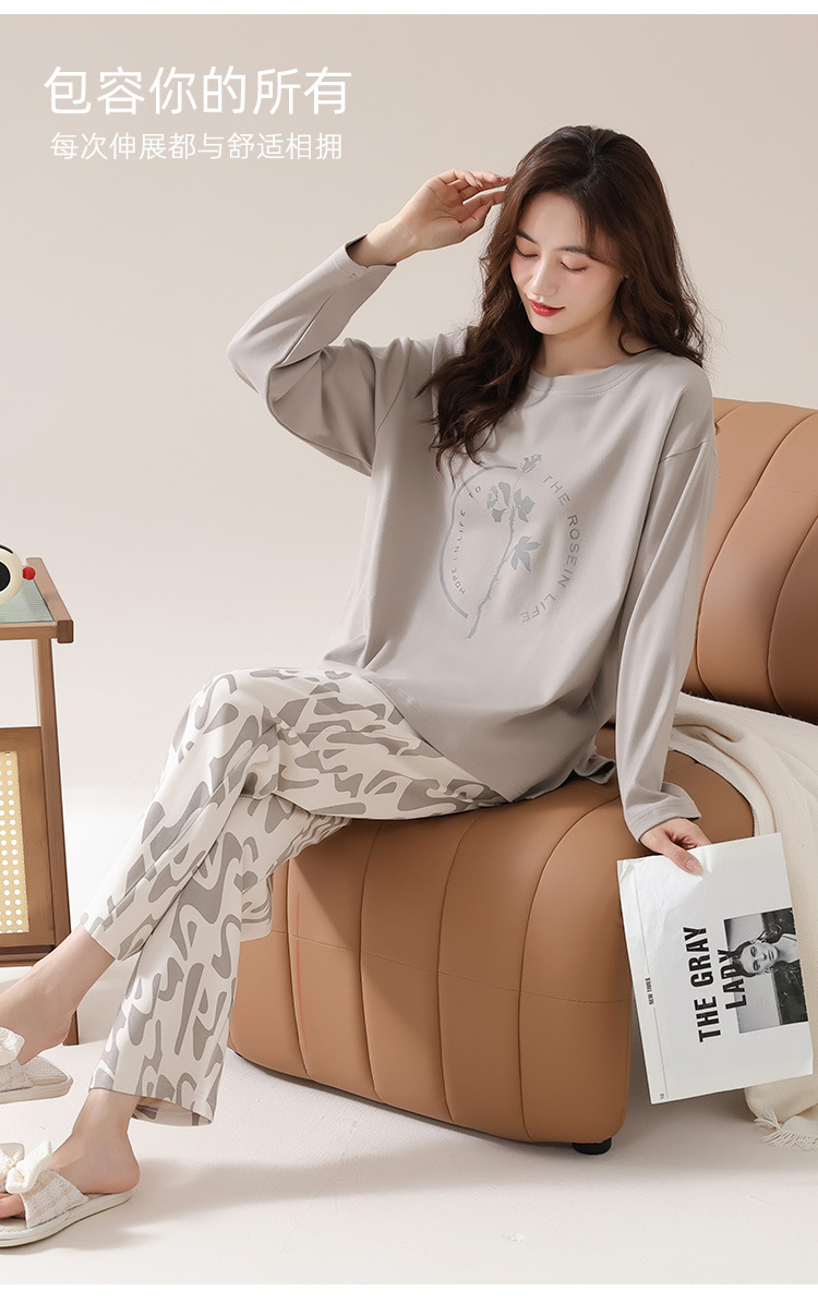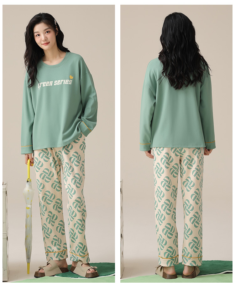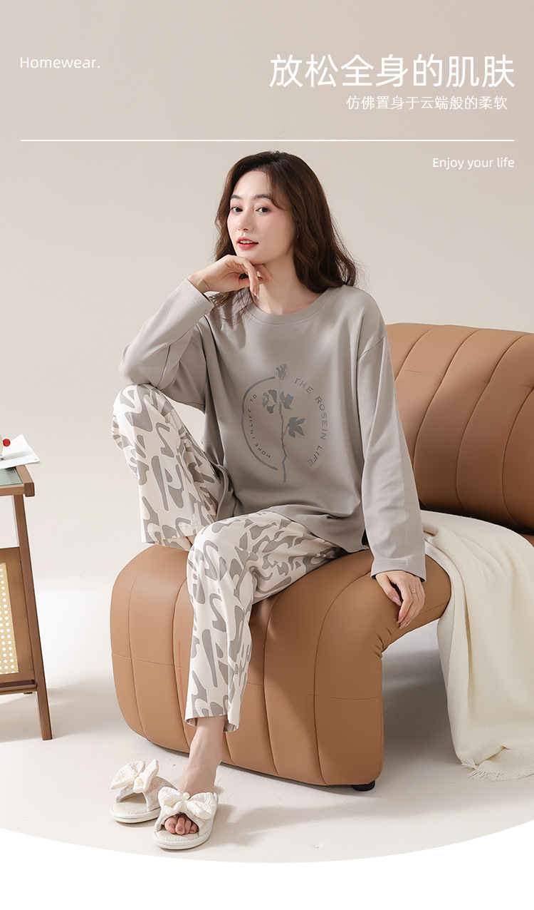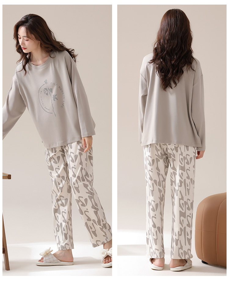 純綿パジャマ女性秋の新型丸首の長袖は秋冬の厚手の純綿の家庭服セットを外に着ることができます。