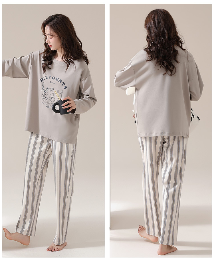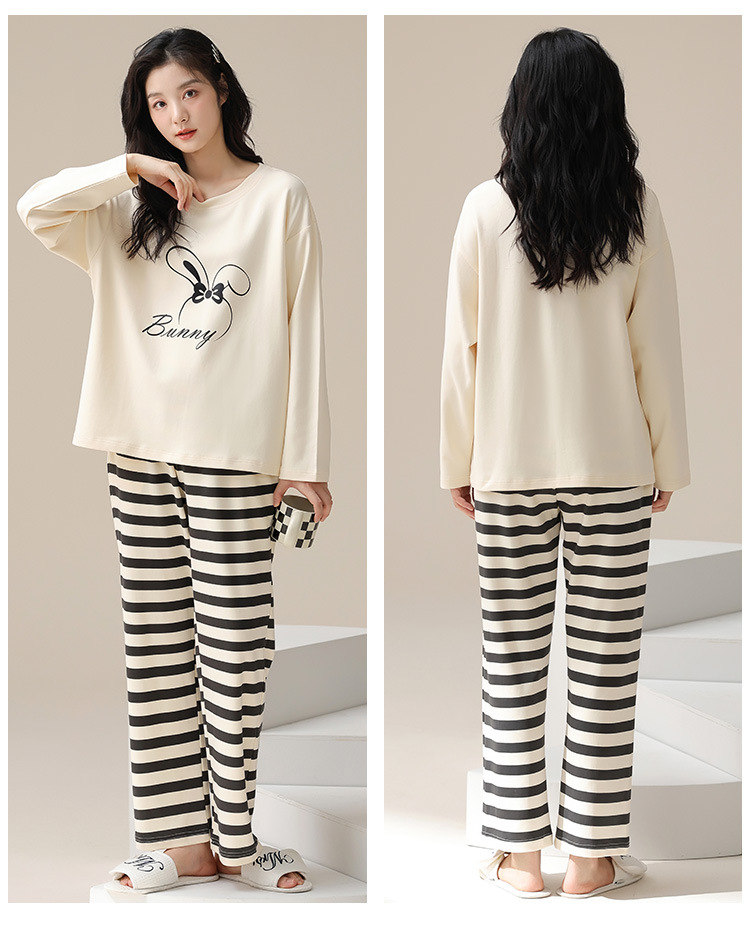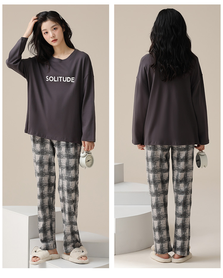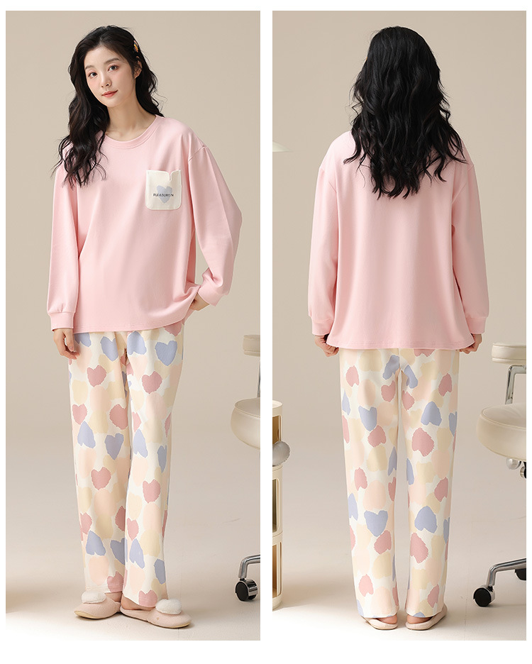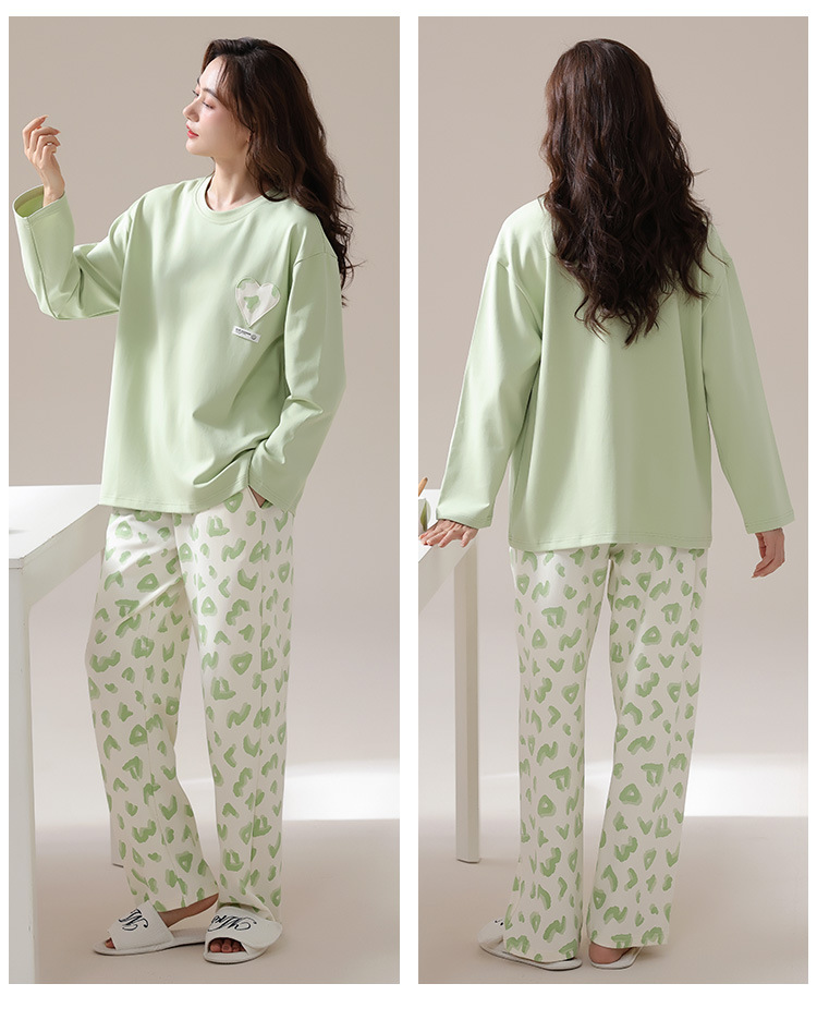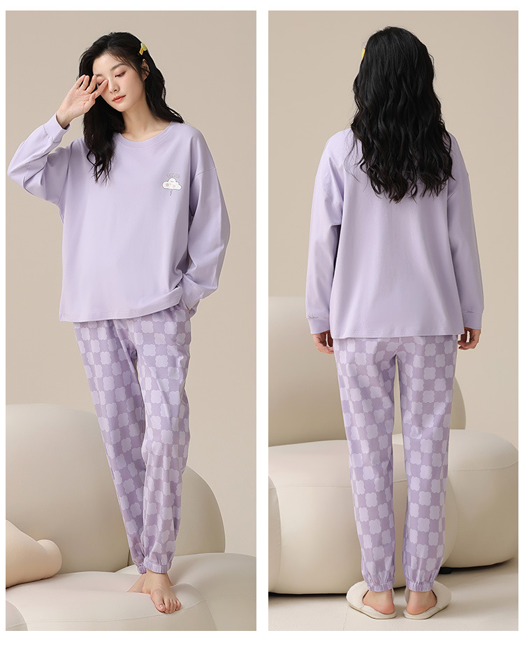 純綿パジャマ女性秋の新型丸首の長袖は秋冬の厚手の純綿の家庭服セットを外に着ることができます。