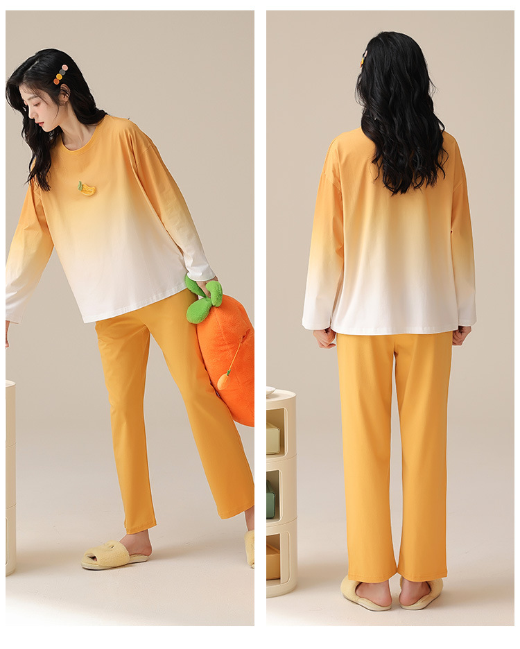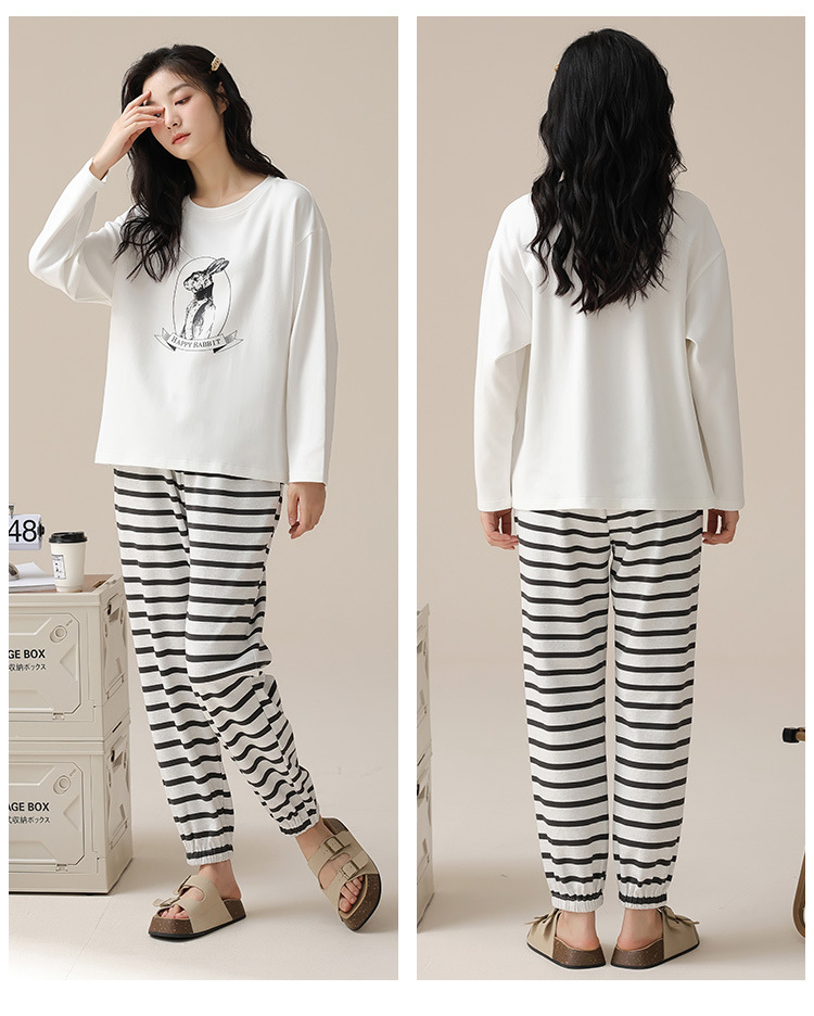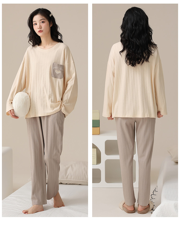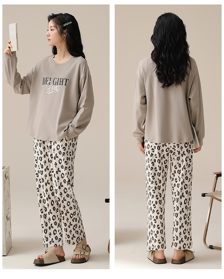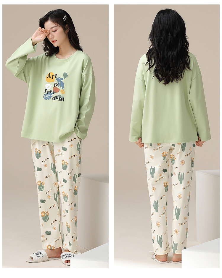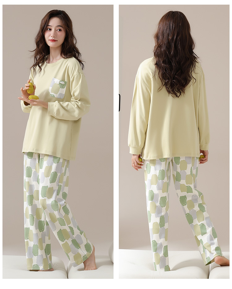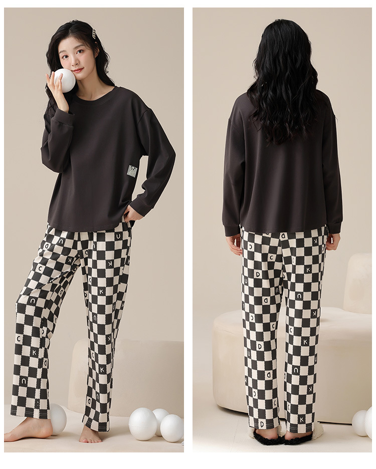 純綿パジャマ女性秋の新型丸首の長袖は秋冬の厚手の純綿の家庭服セットを外に着ることができます。