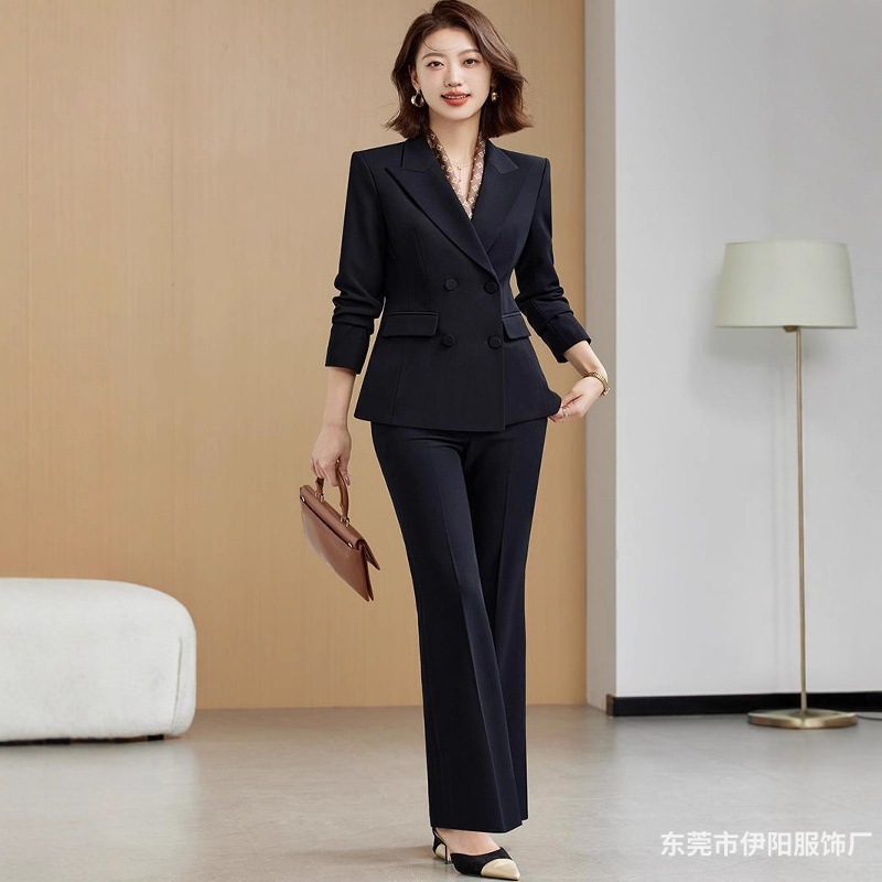 高级职业套装女职场通勤商务西服黑色休闲微喇裤气质主持人工作服