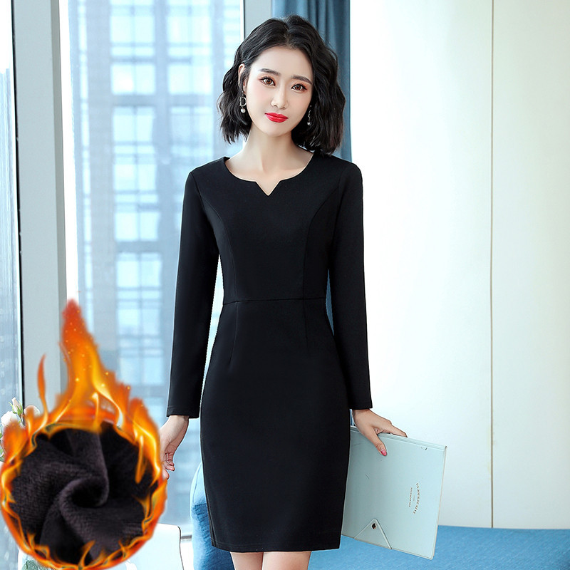2022秋冬服の修身の中に、ベーススカートの長袖とベルベットの厚いワンピースの女性の純粋な黒色の弾力性のスカートを掛けます。