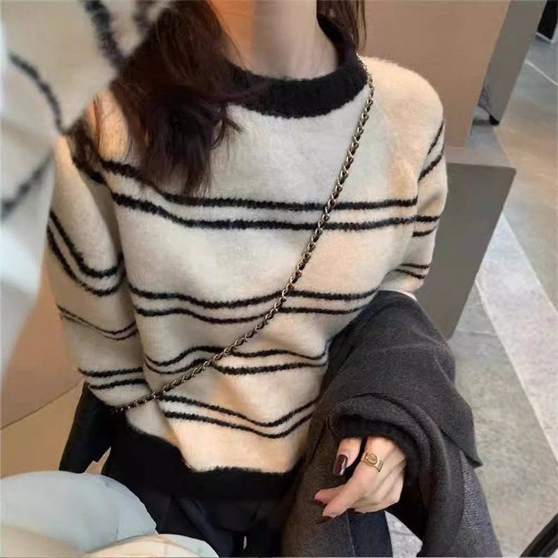 ストライプの丸首の長袖の頭の柔らかいモチモチのセーターの女性の秋冬の短いタイプの怠惰な風のゆったりしている内は底のメリヤスの上着を掛けます。