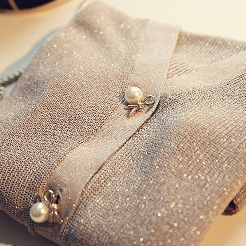日焼け止めカーディガンの夏のChicの短いタイプの外は明るい糸の氷のvネックの真珠のボタンのニットの薄いショールのコートの女性を掛けます。