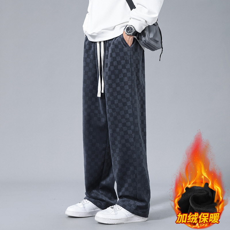 2025秋冬新作 チェック柄カジュアルパンツ メンズ 裏起毛 厚手 トレンドブランド ゆったり 多用途 ドレープ感 ワイドレッグ ストレートパンツ