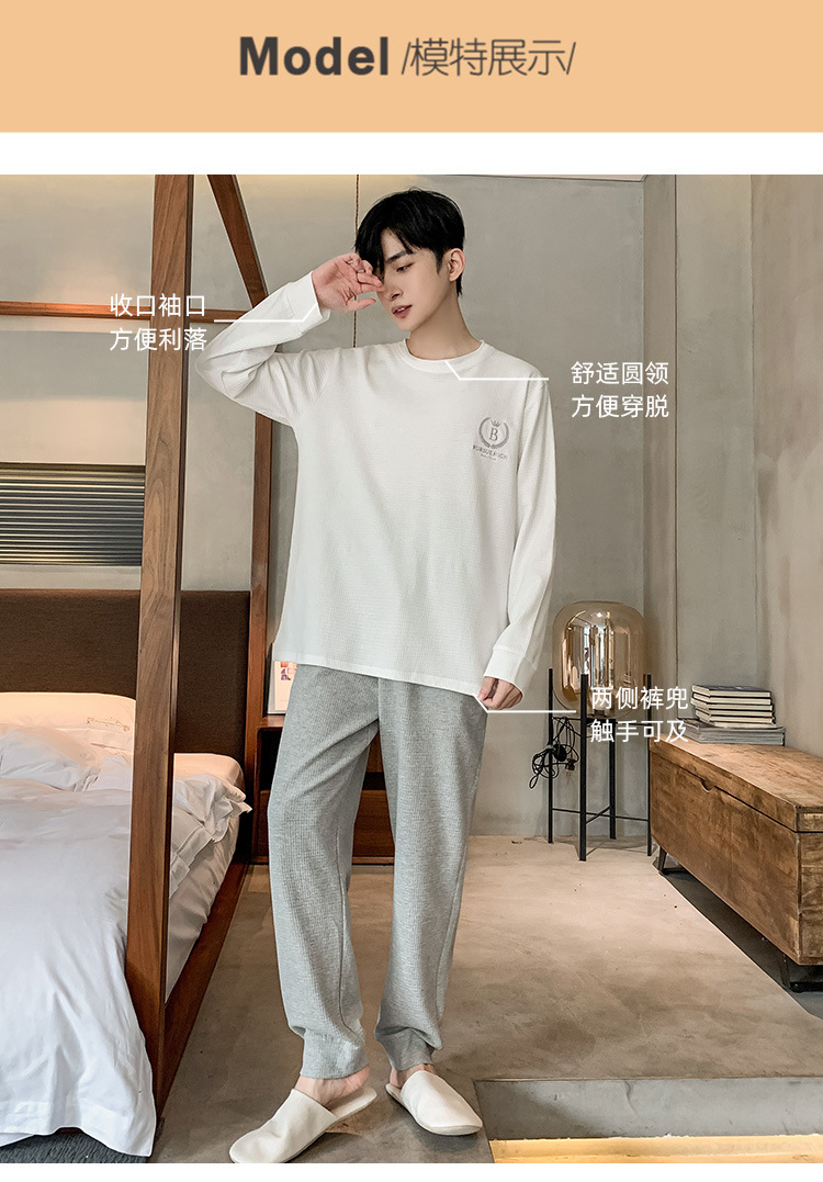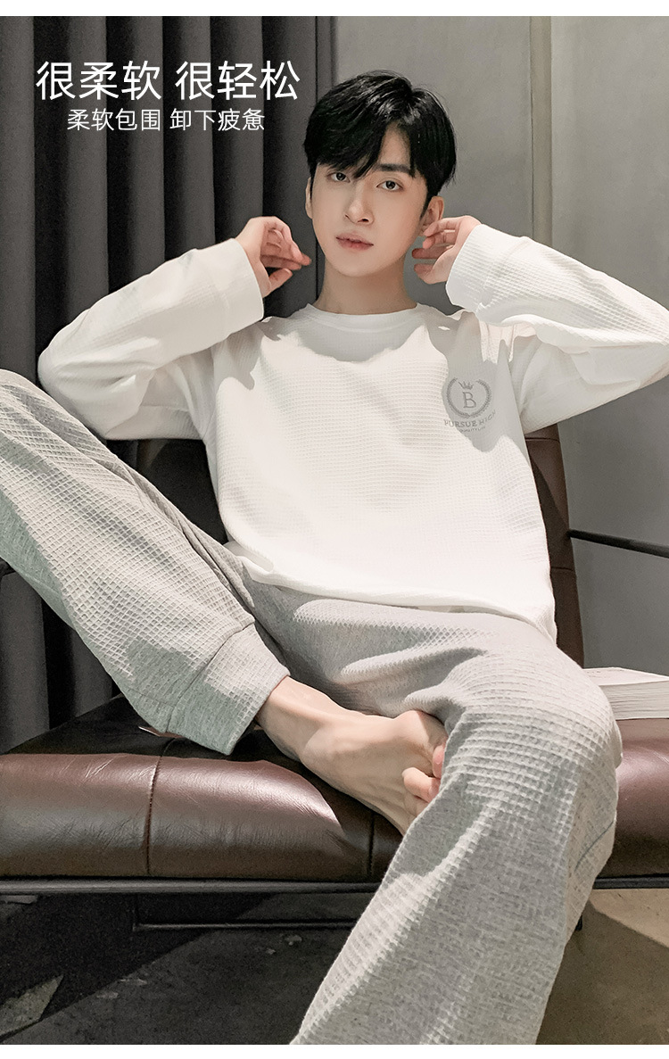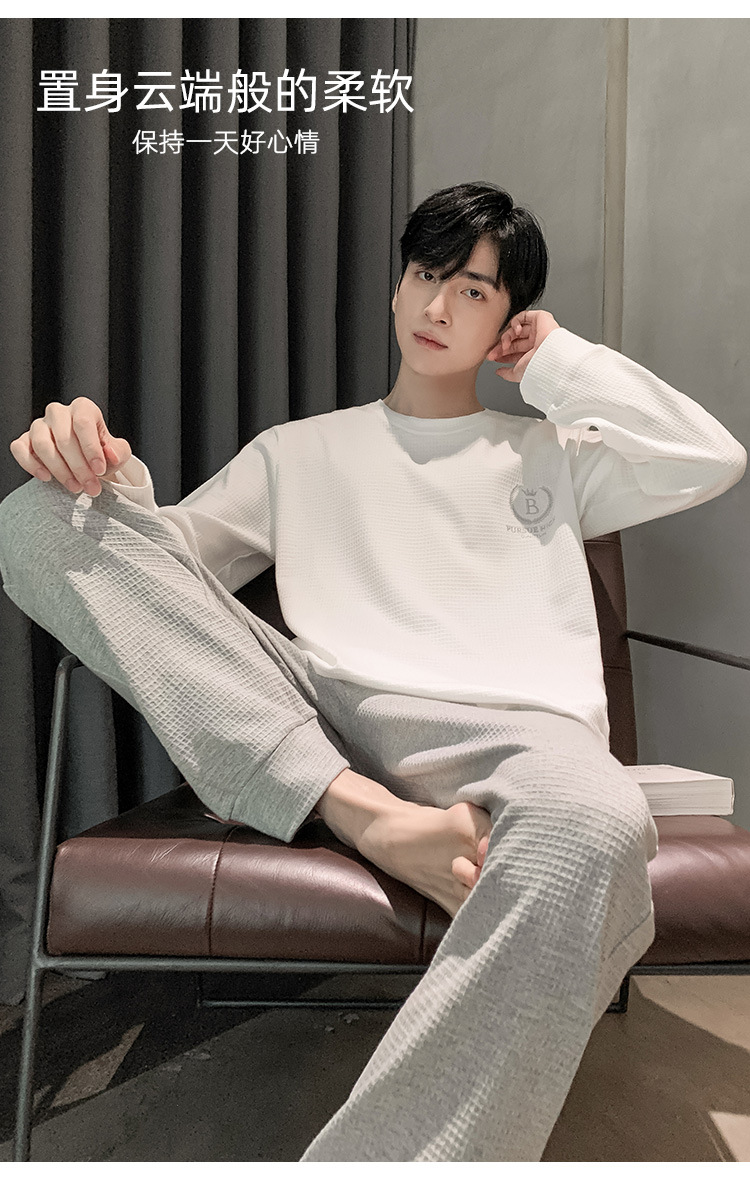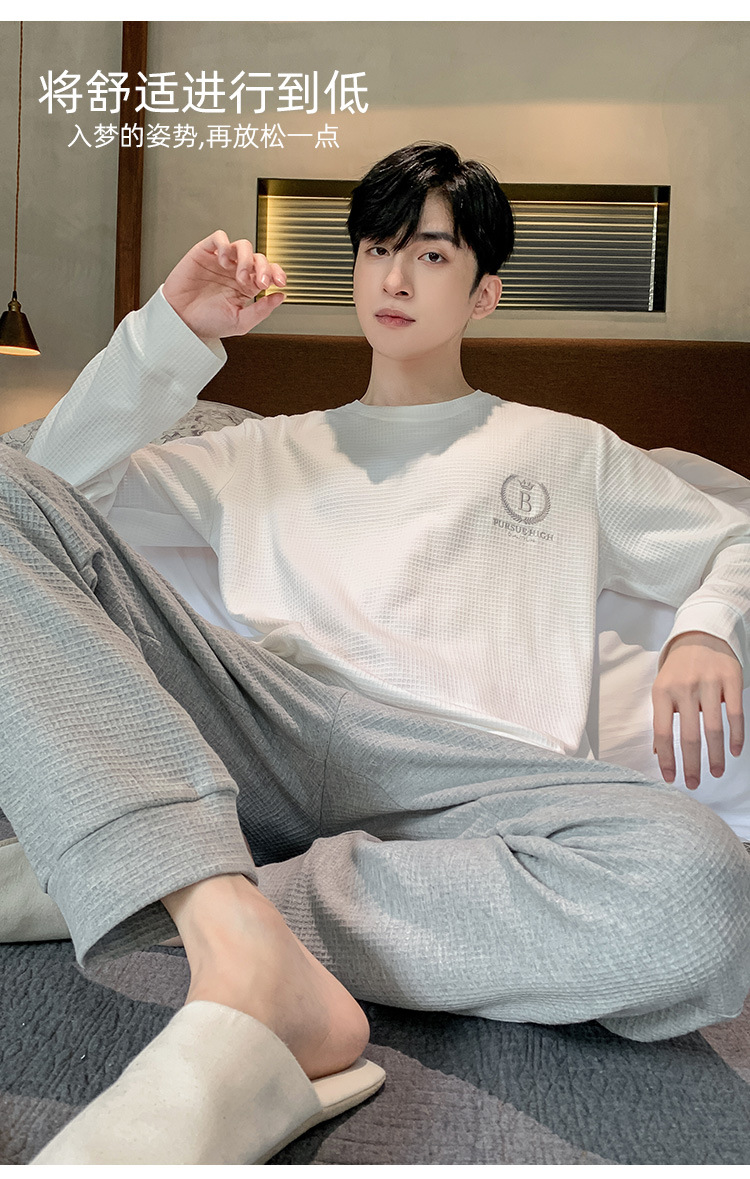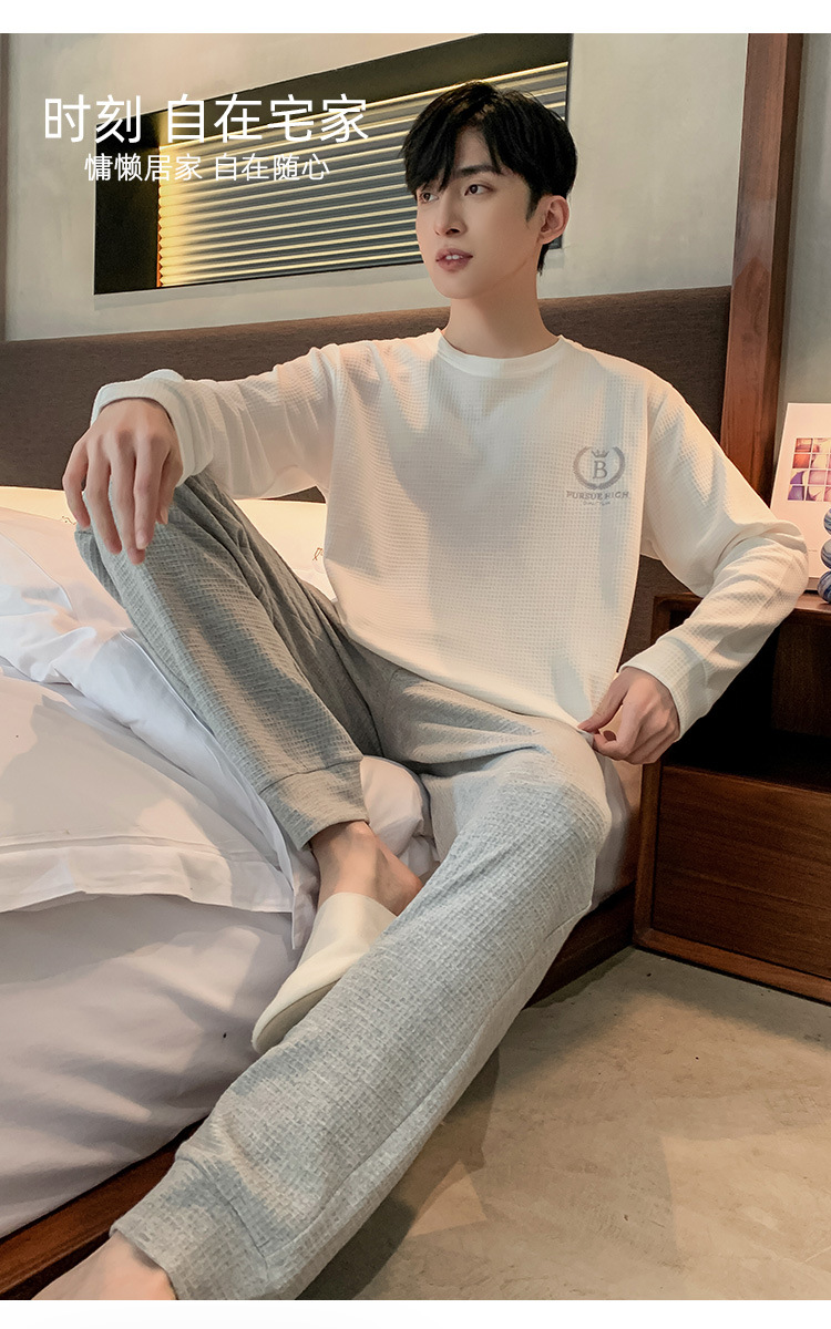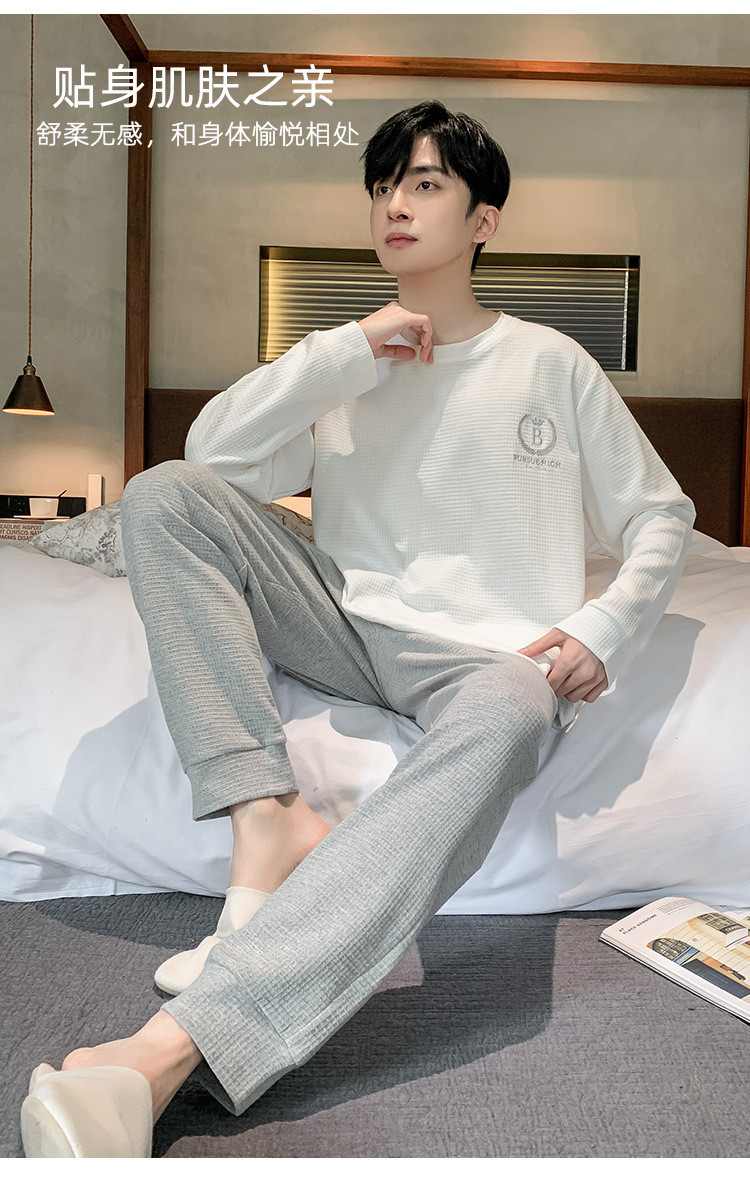 ワッフル純綿パジャマ男性秋の新しいカジュアルサイズは、綿長袖の家庭服男性セットを着ることができます