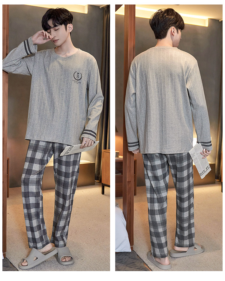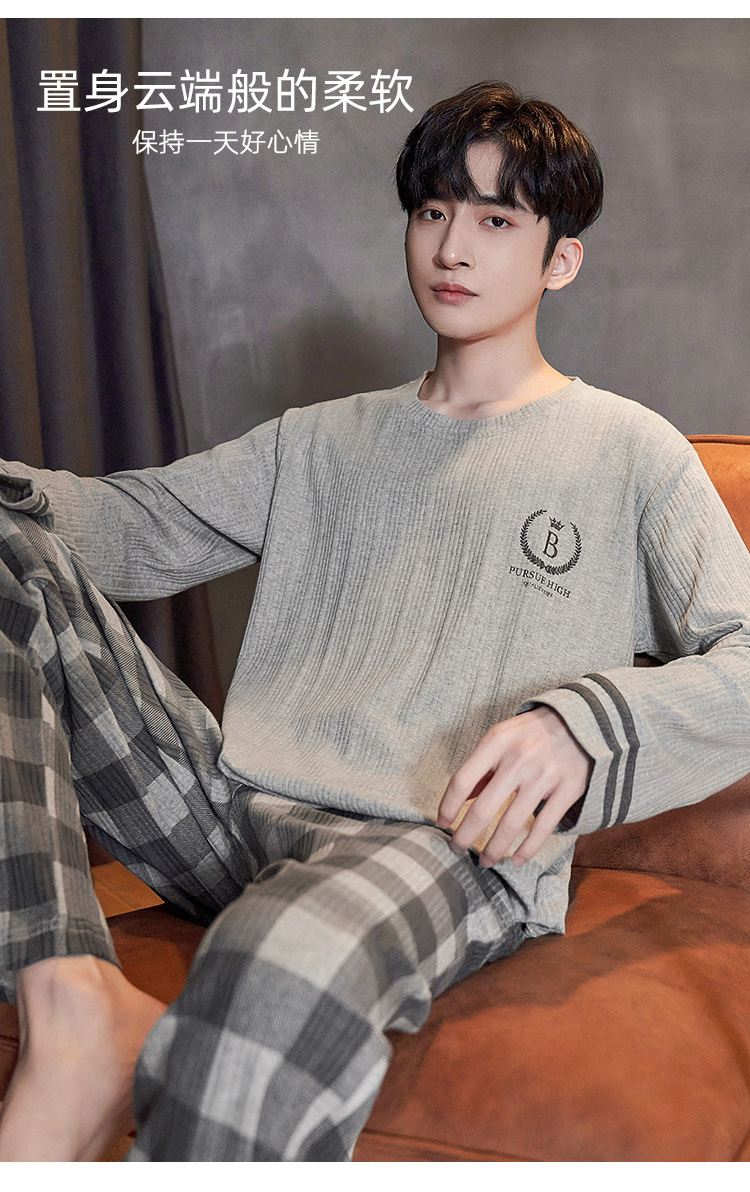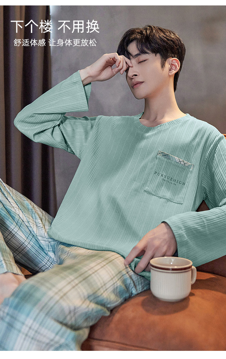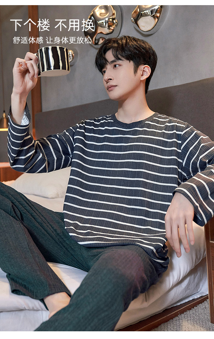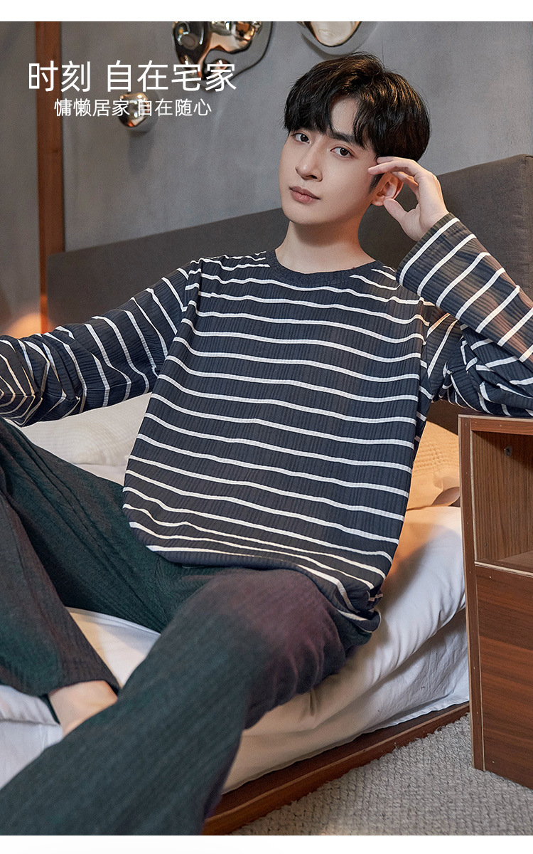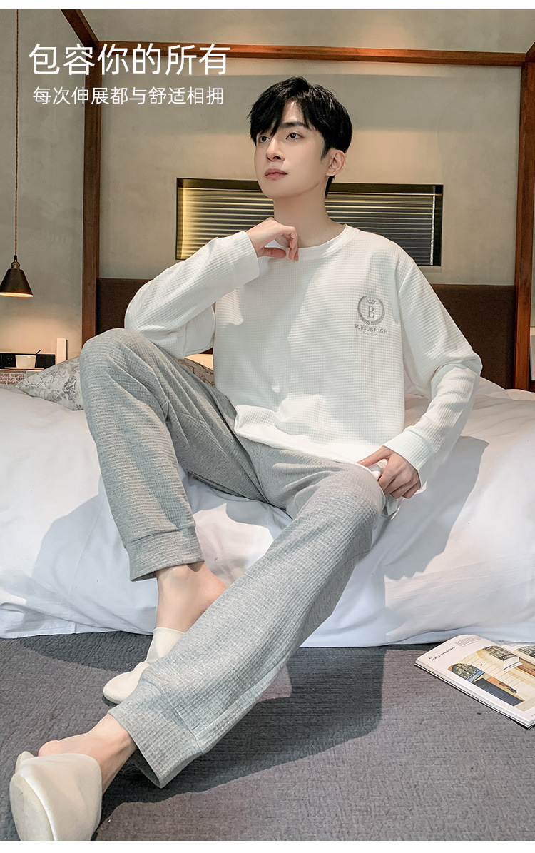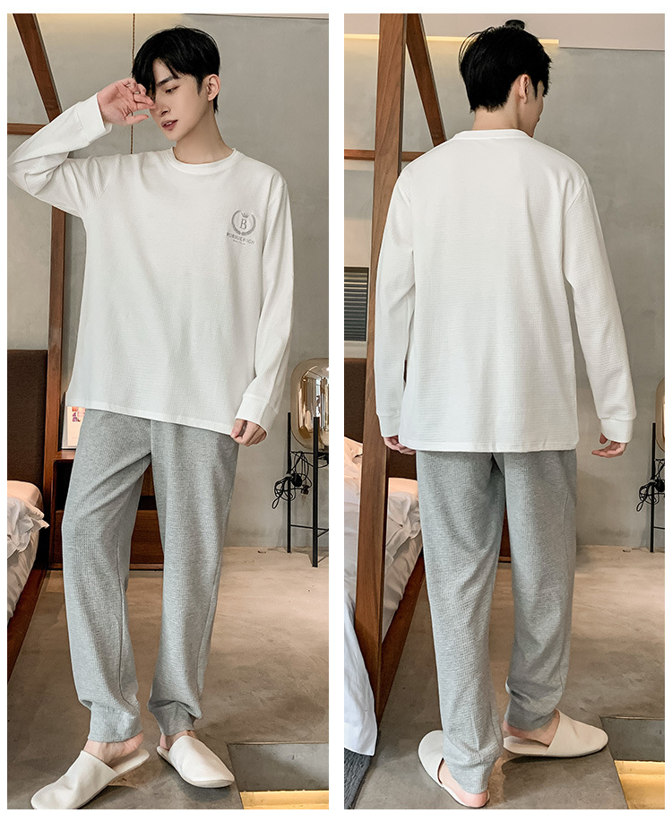 ワッフル純綿パジャマ男性秋の新しいカジュアルサイズは、綿長袖の家庭服男性セットを着ることができます