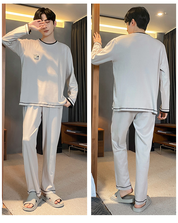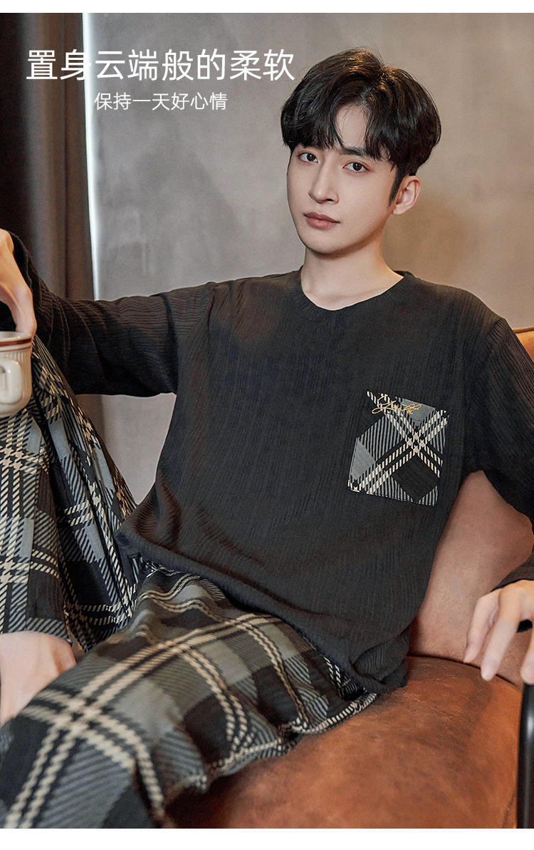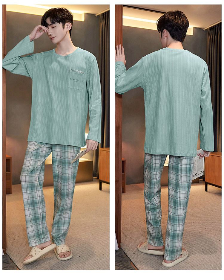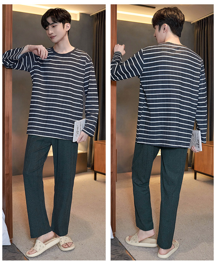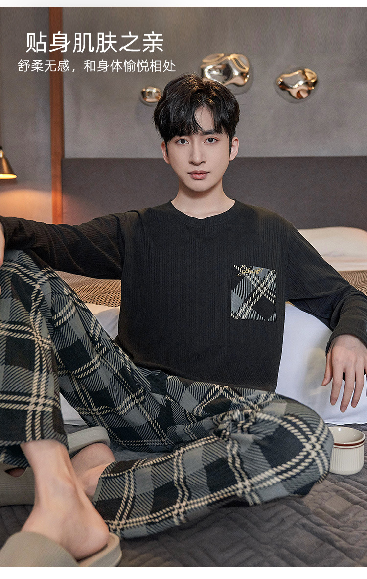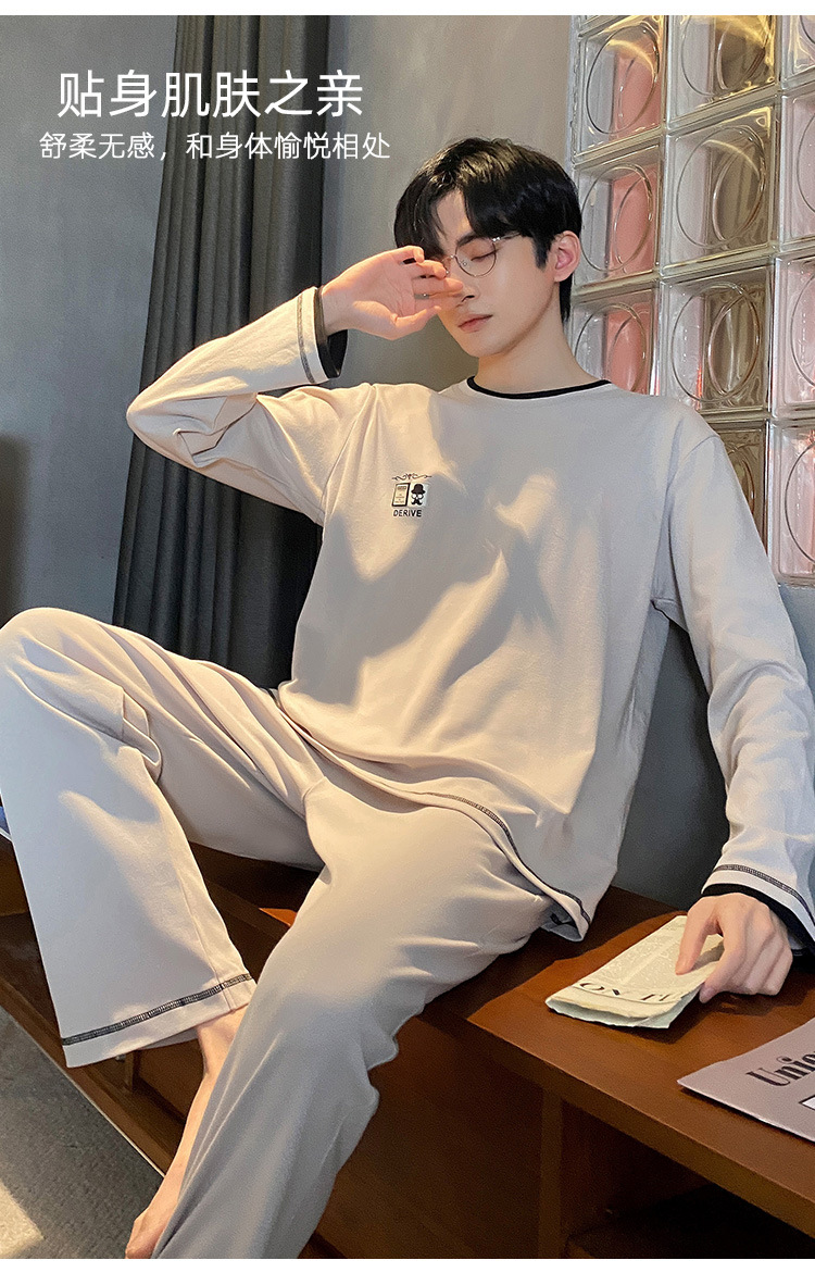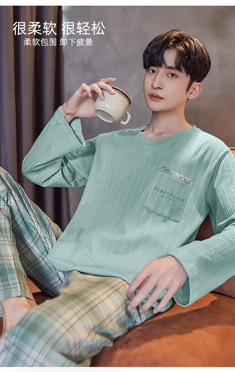 ワッフル純綿パジャマ男性秋の新しいカジュアルサイズは、綿長袖の家庭服男性セットを着ることができます