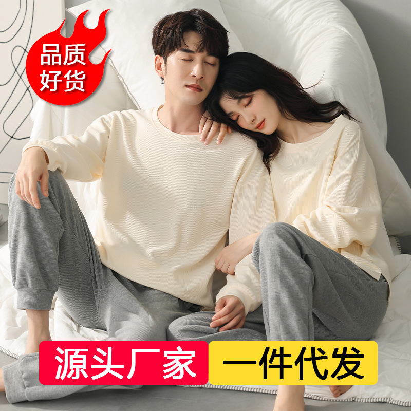 カップルパジャマ女性純綿男性秋の厚手のワッフルルーム服秋冬二点セットは外着ができます。