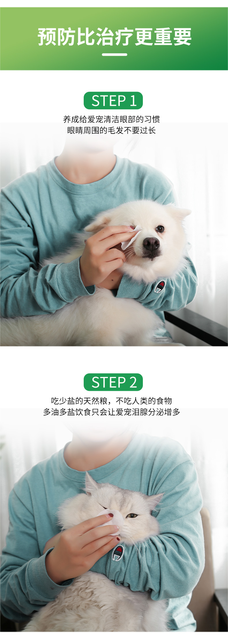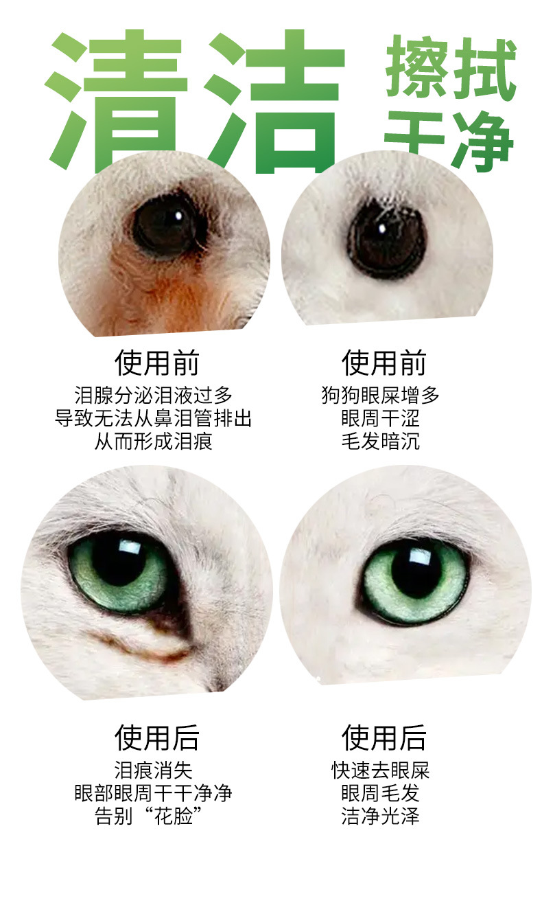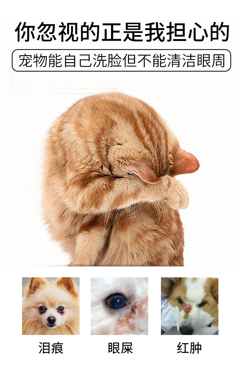 ペットは涙の跡に行きます。猫の目の部分は濡れます。犬は目の糞を拭きます。