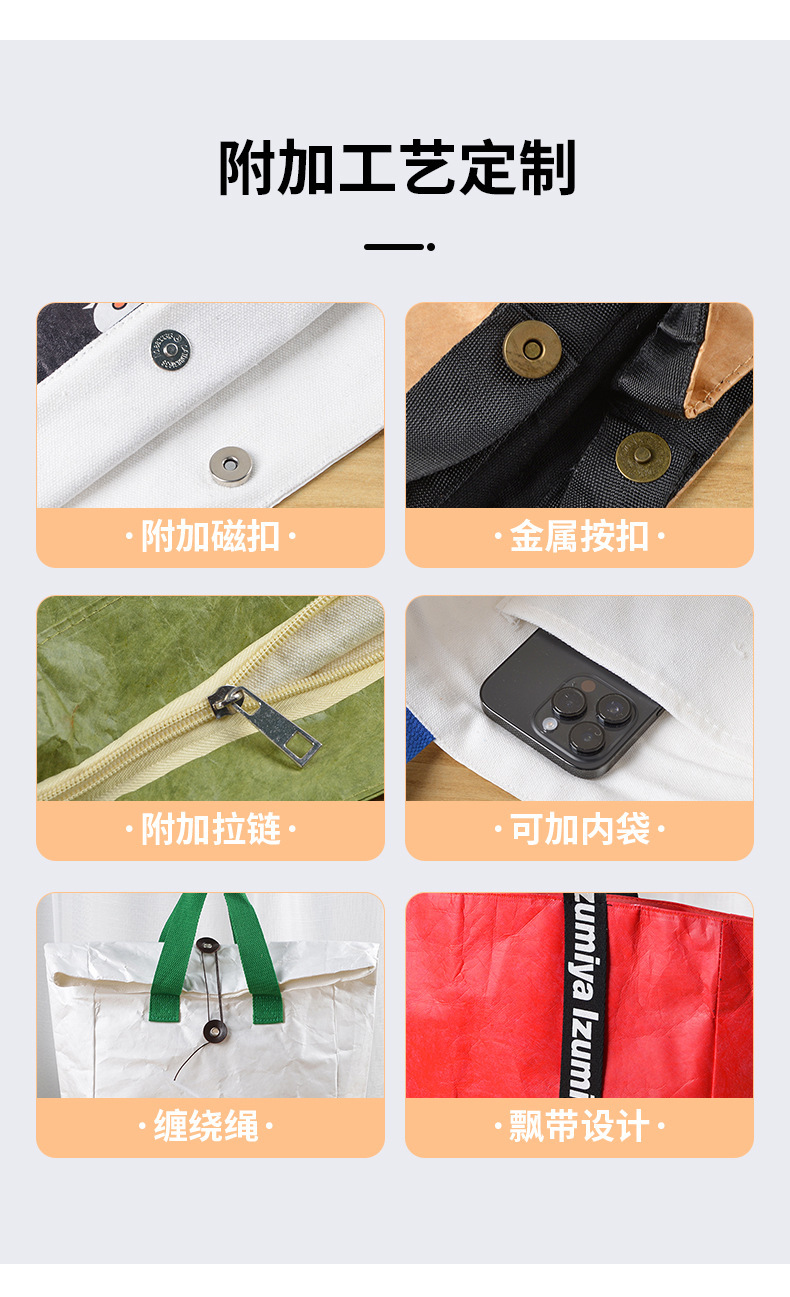 クリエイティブでファッショナブルなレトロなジッパー付きデュポン紙袋、カスタムウォッシュトートバッグ、牛革デュポン紙袋、ロゴ印刷可能