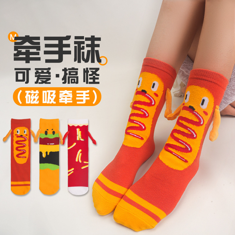 国境を越えた漫画柄の磁気で繋がる手つなぎソックス、ハンバーガー、フライドポテト、ホットドッグ柄のミドル丈ソックス、薄手の綿ソックス、男女兼用の手つなぎソックス