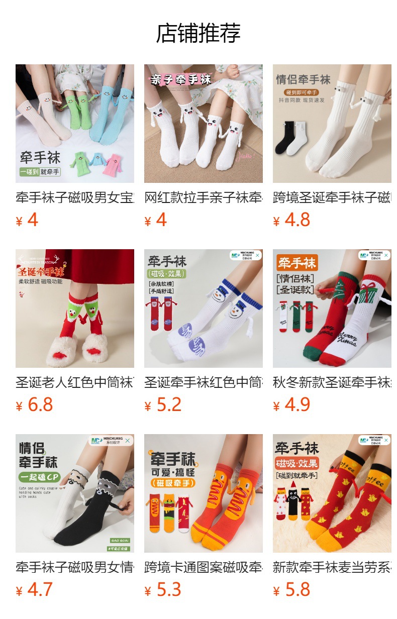 牵手袜子磁吸男女中筒袜可爱搞怪笑脸彩色网红款拉手亲子袜