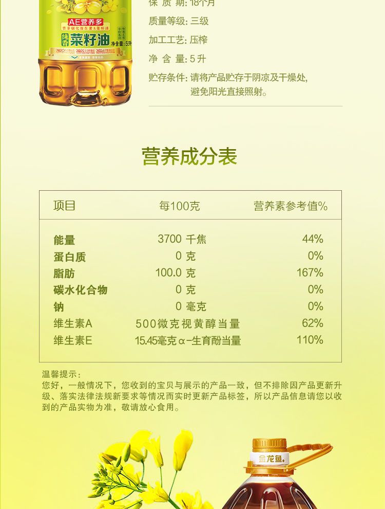 金龍魚ae栄養多純香菜種油5リットル非遺伝子組換え栄養強化ビタミンa物理プレス食