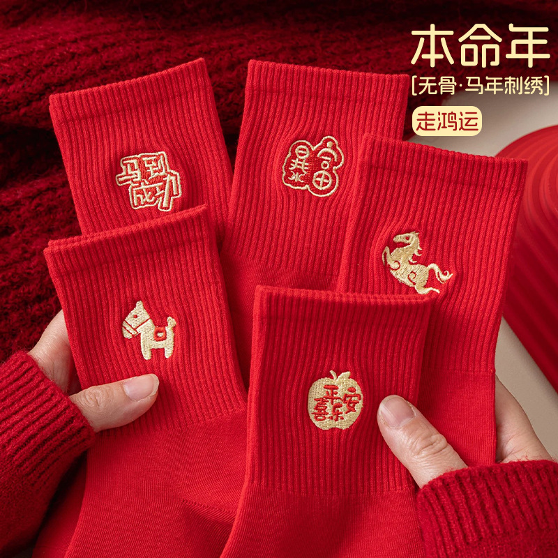 馬年生まれの方向けの赤い靴下、男女兼用秋冬中筒綿靴下、結婚カップル用赤い新年靴下ギフトボックス入り