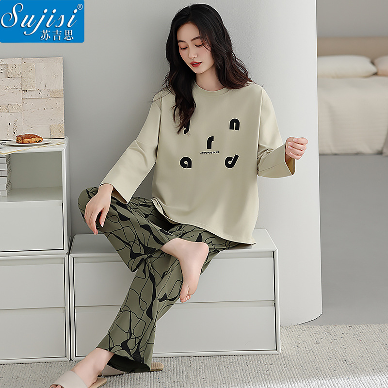 春秋季新款百分百纯棉长袖长裤圆领宽松休闲睡衣家居服可外穿女