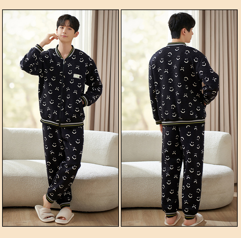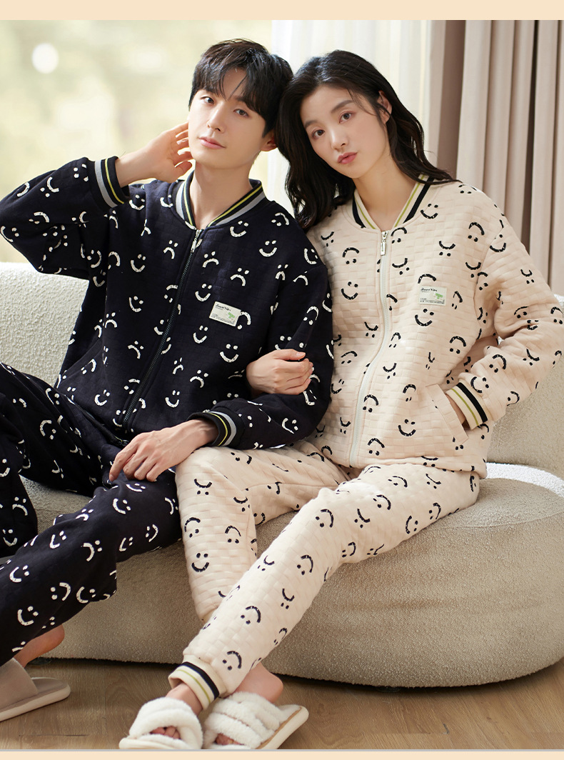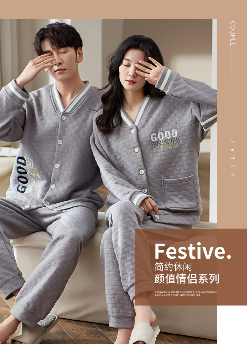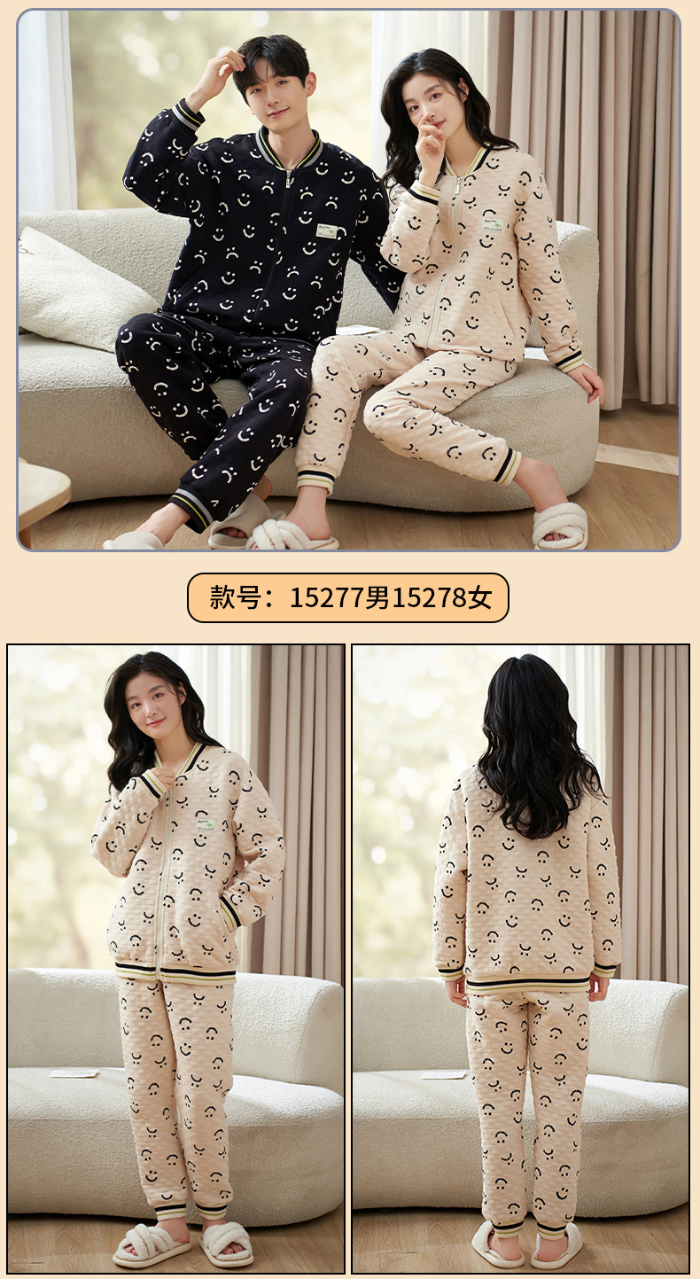 情侣睡衣男女秋冬季半边绒加绒加厚青少年V领开衫保暖家居服套装
