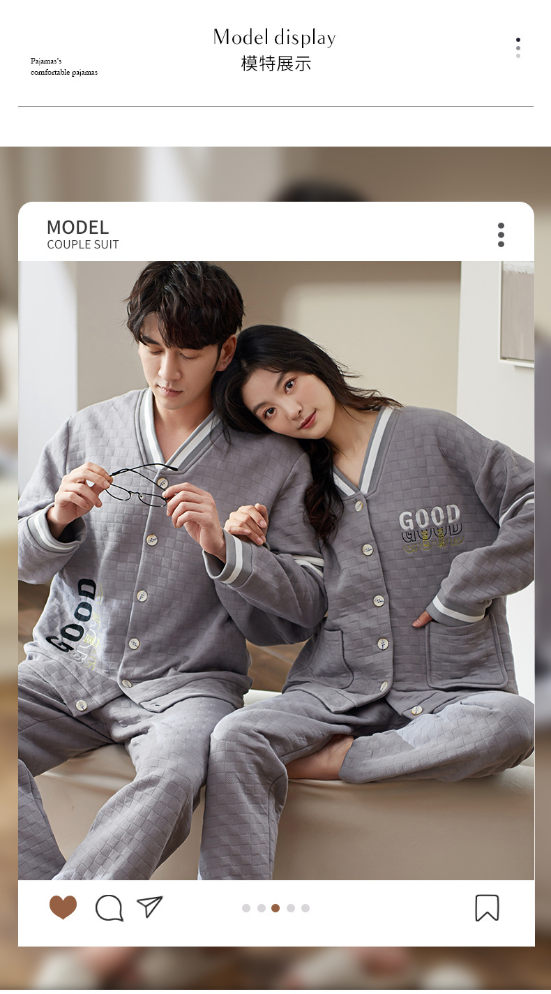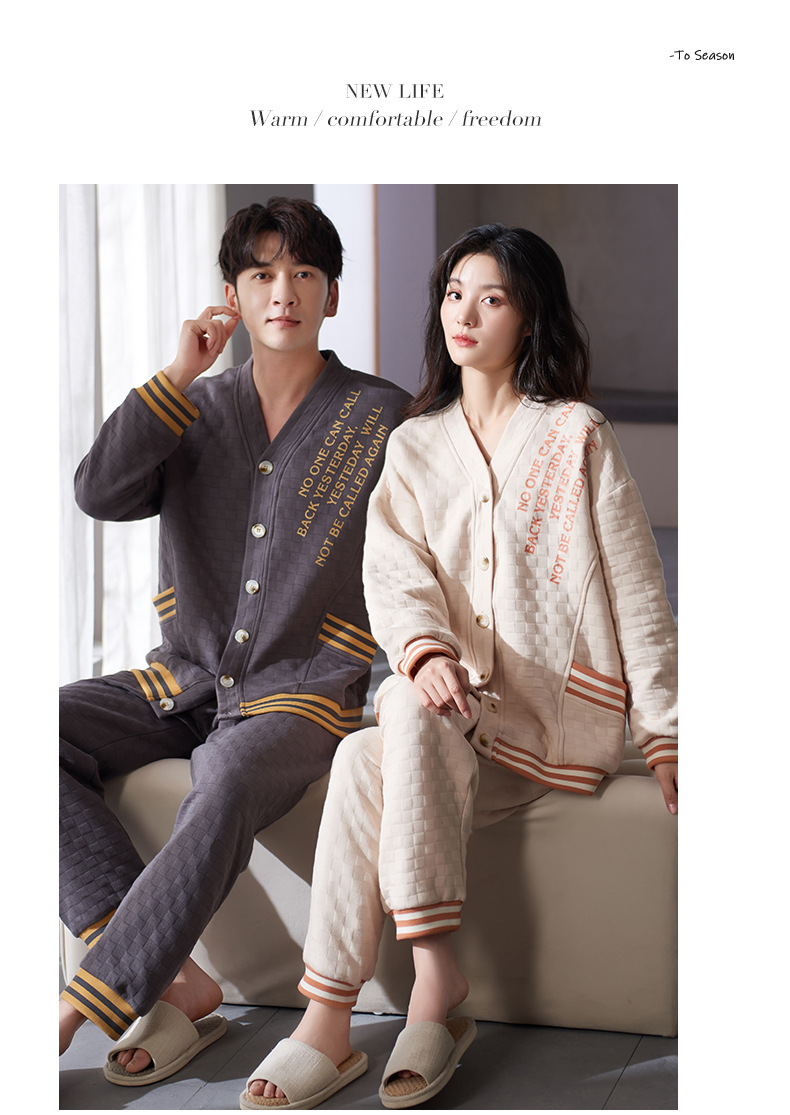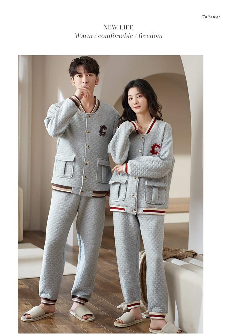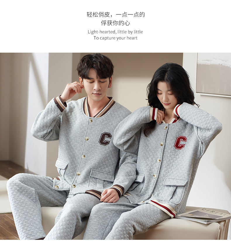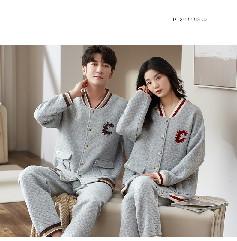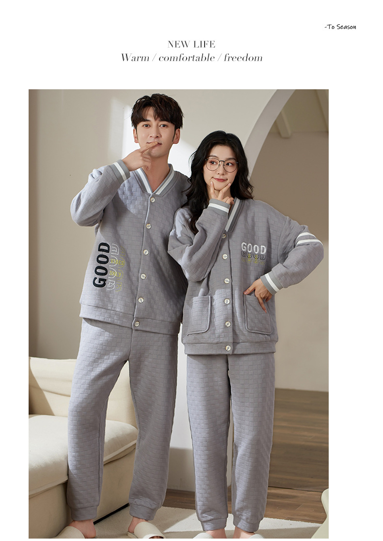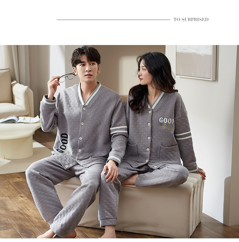 冬のカップルのパジャマの新型vネックのカーディガンの純綿の保温の3層の中間層は外に女性の長袖の部屋の服を着ることができます。
