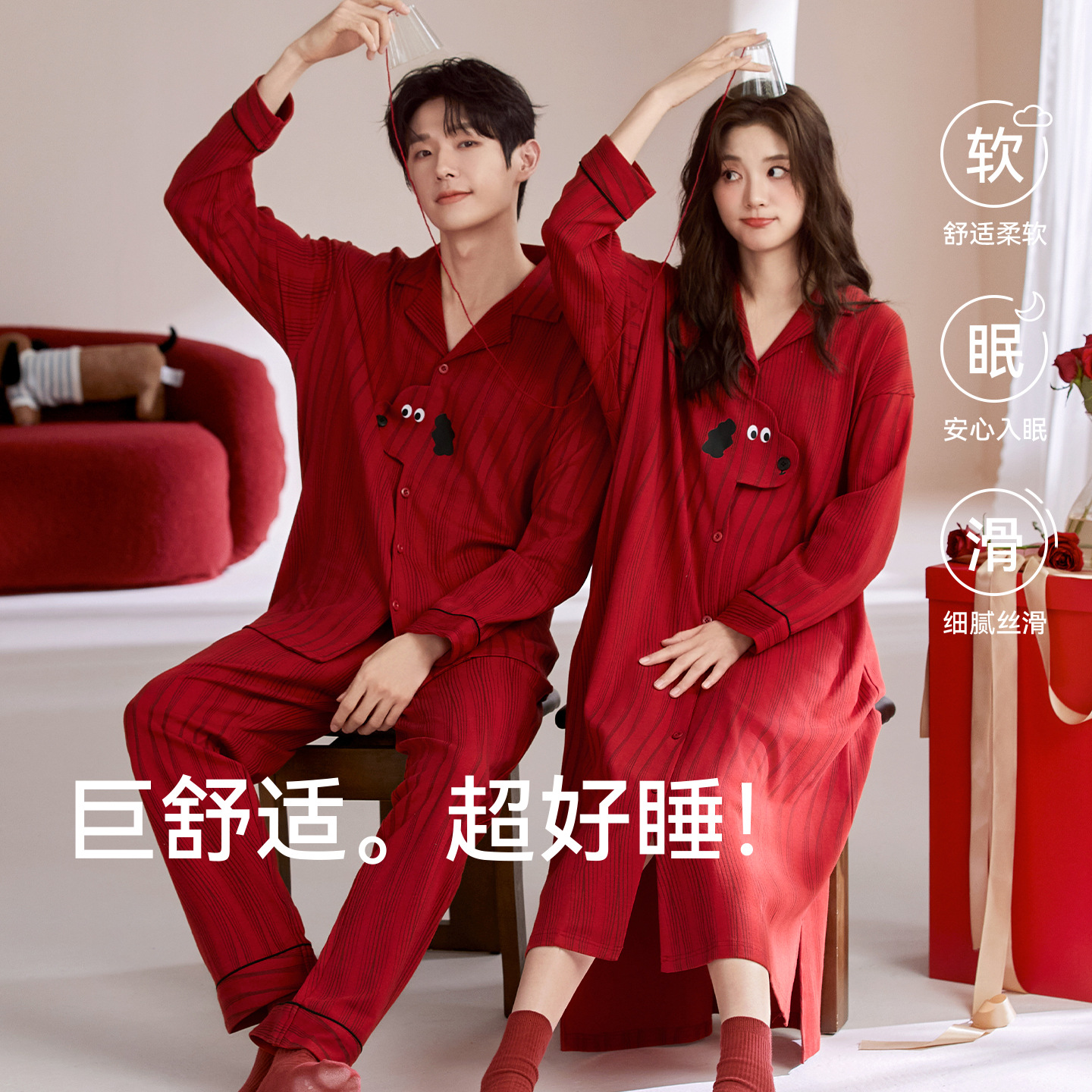 睡衣结婚新婚情侣套装红色秋拉架棉长袖睡裙情侣装男女新款衬衫裙