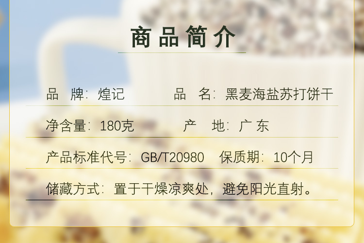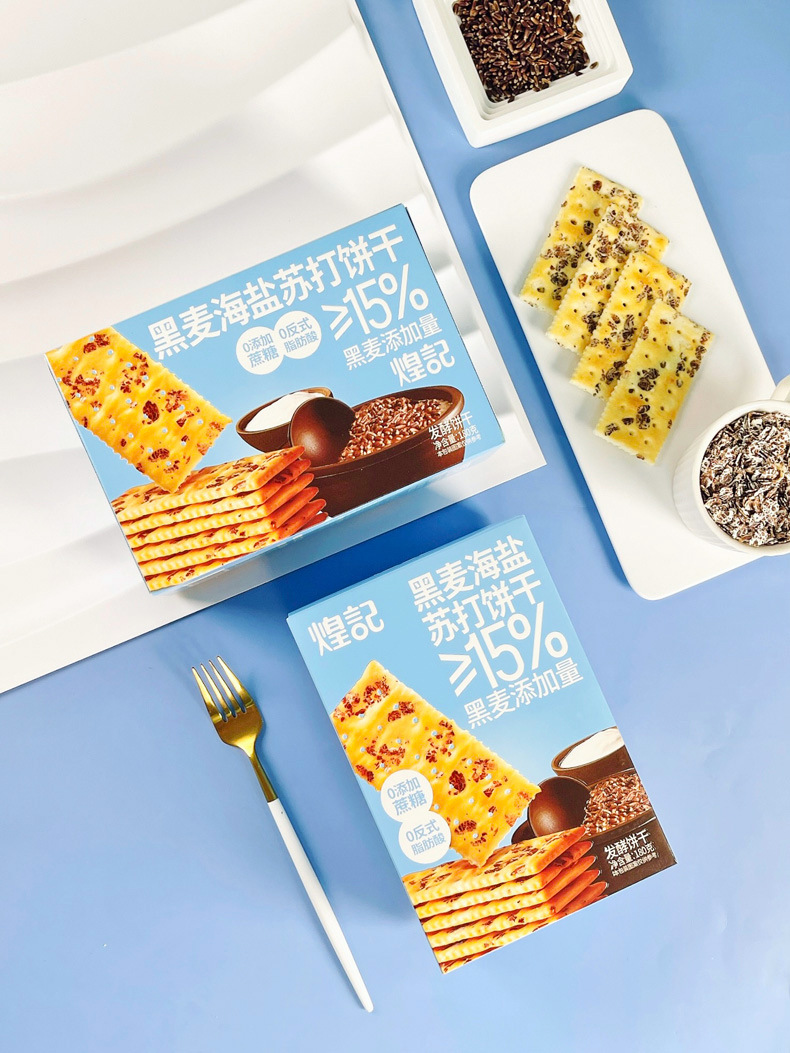煌記新商品の黒麦海塩ソーダビスケット0ショ糖0トランス式脂肪酸180g箱に入っています。