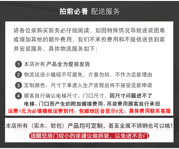 【备注】:该产品为高端定制家具,颜色材质尺寸均可定制,无重大质量问题不接受退换货