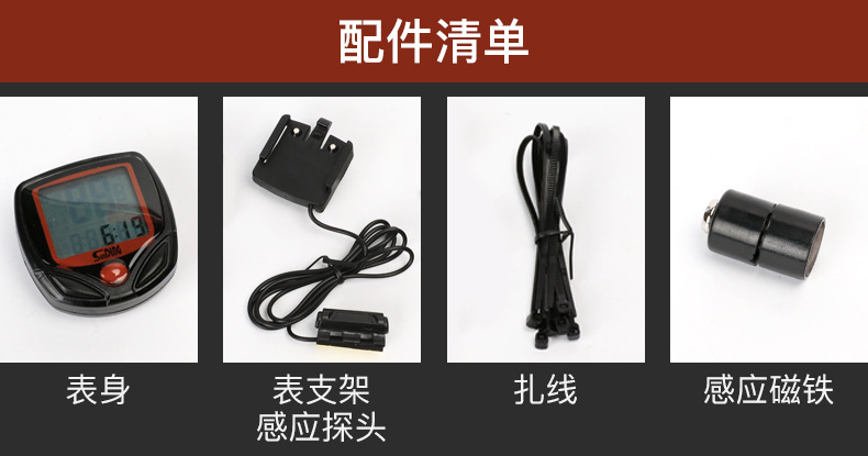 【配置】 表身,表支架(有线连着感应探头),感应磁铁,扎线,中文说明书
