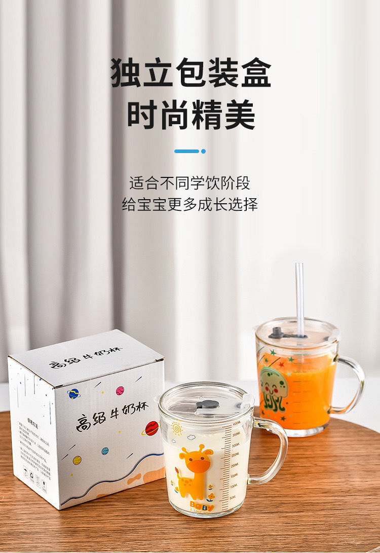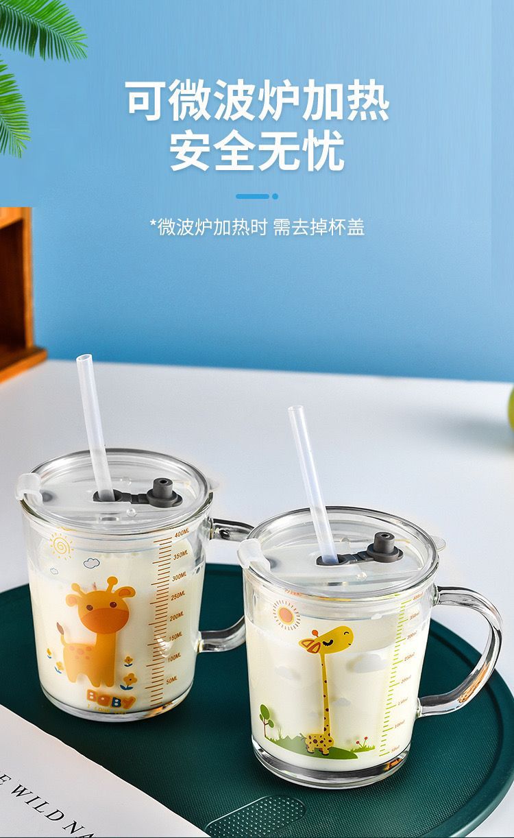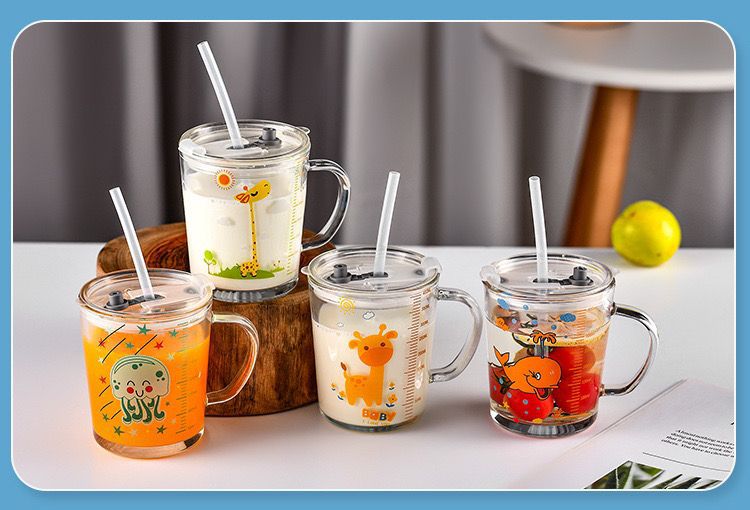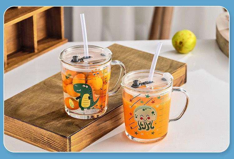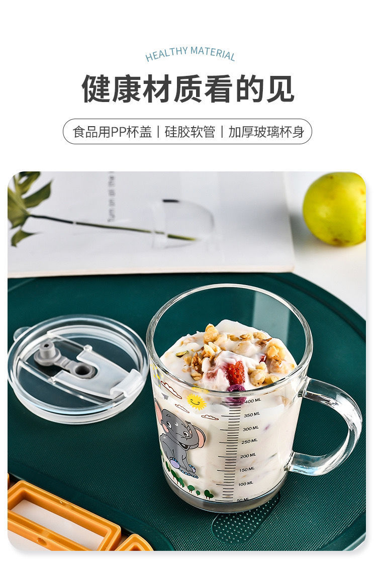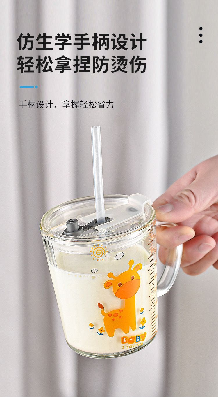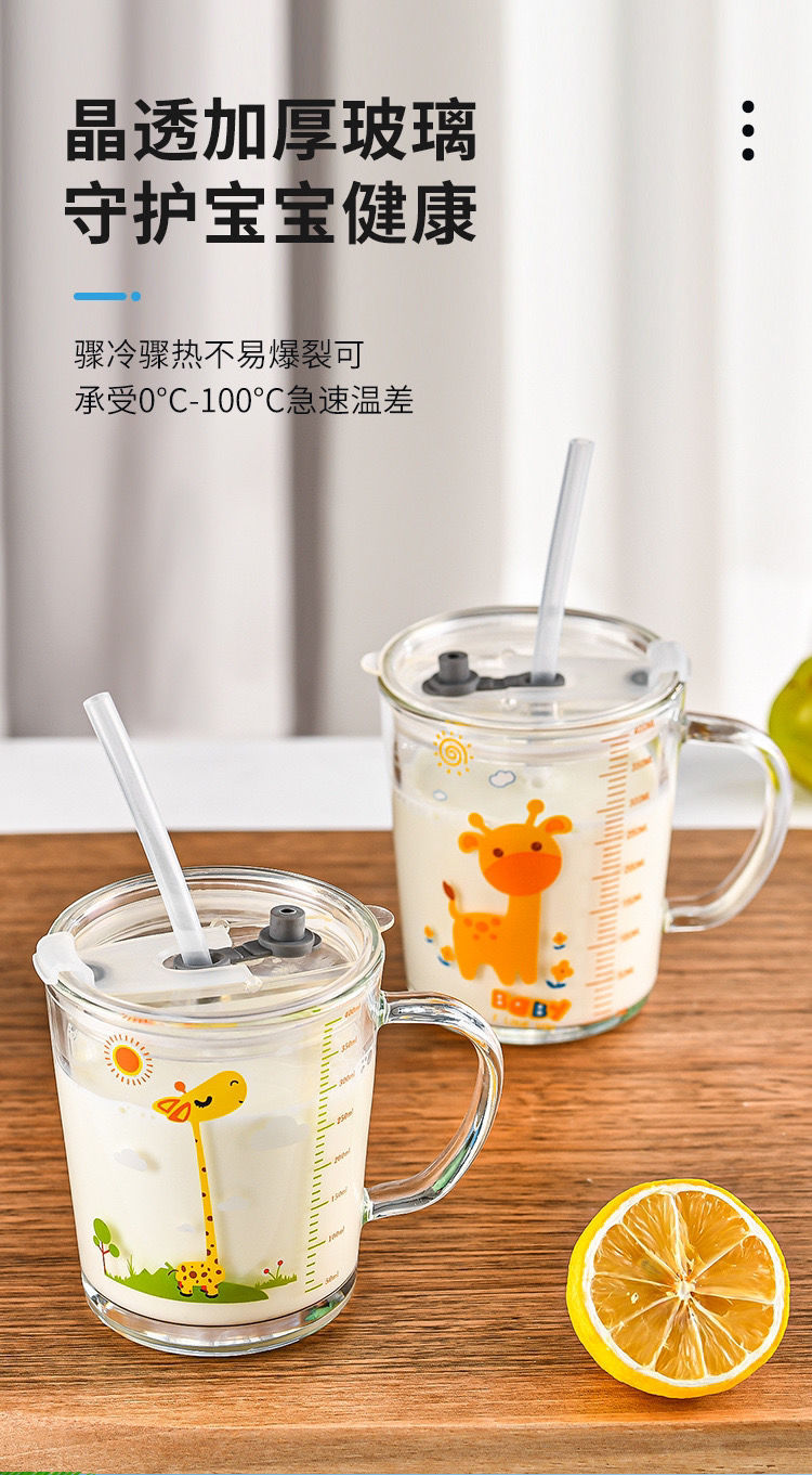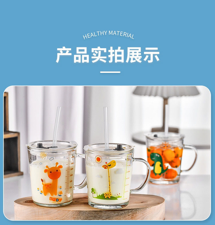 ミルクカップ子供スケールカップ朝食デザートカップ漫画高颜値シール漏れ防止ストロー付きガラスカップ