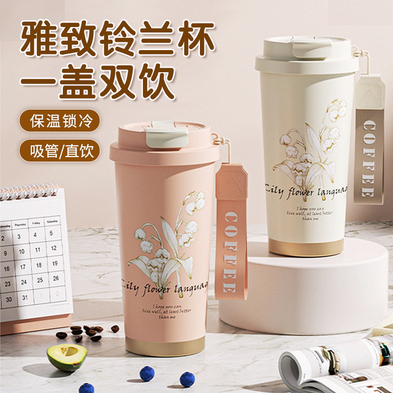 新商品316ステンレス保温カップ高顔値鈴蘭コーヒー保温カップ携帯二重飲みストローカップコップコップ