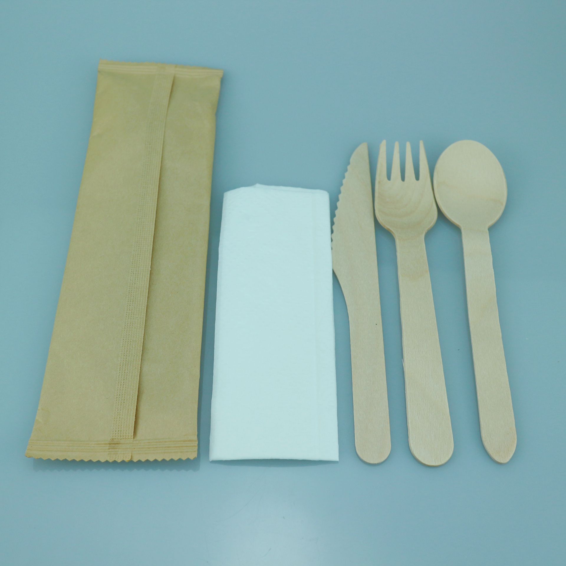 メーカー直接供給使い捨て木製カトラリー、フォーク、スプーンプラスチックフィルムクラフト紙フィルム個別包装分解性木製食器