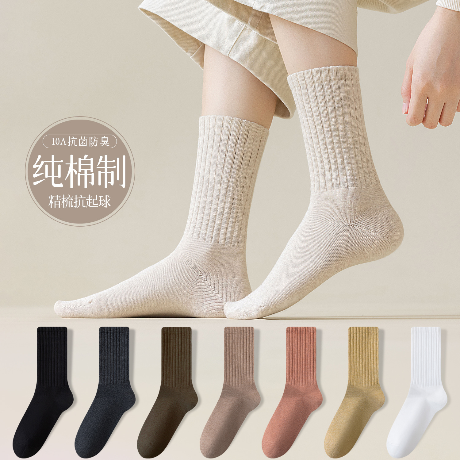 纯棉袜子女秋冬中筒袜纯色系休闲袜舒适百搭抗菌防臭诸暨袜子批发