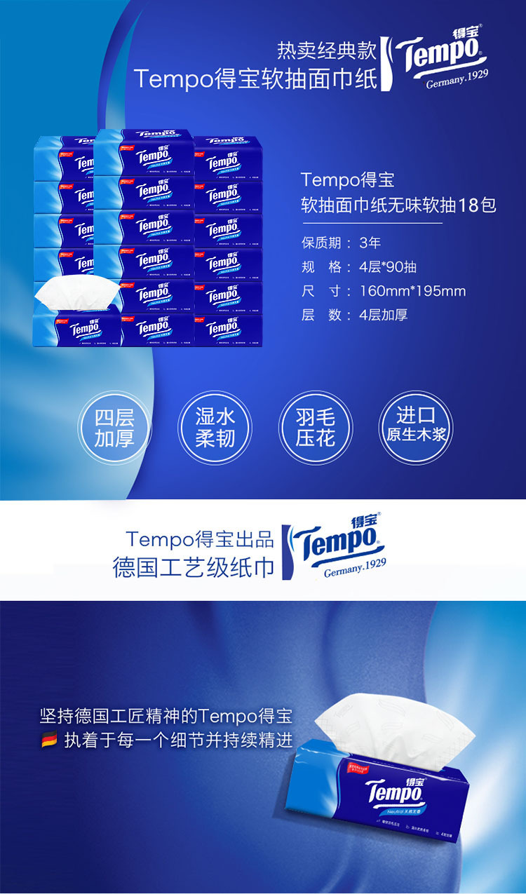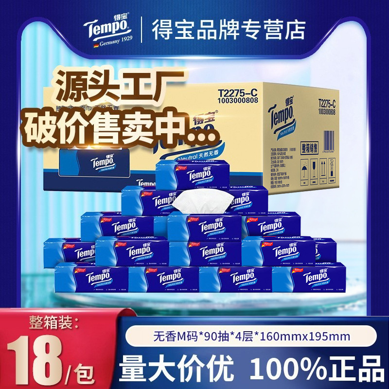 Tempo得宝抽纸90抽无香加厚4层抽取式面巾纸18包箱装餐巾纸抽纸