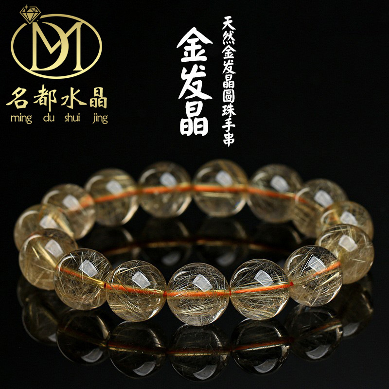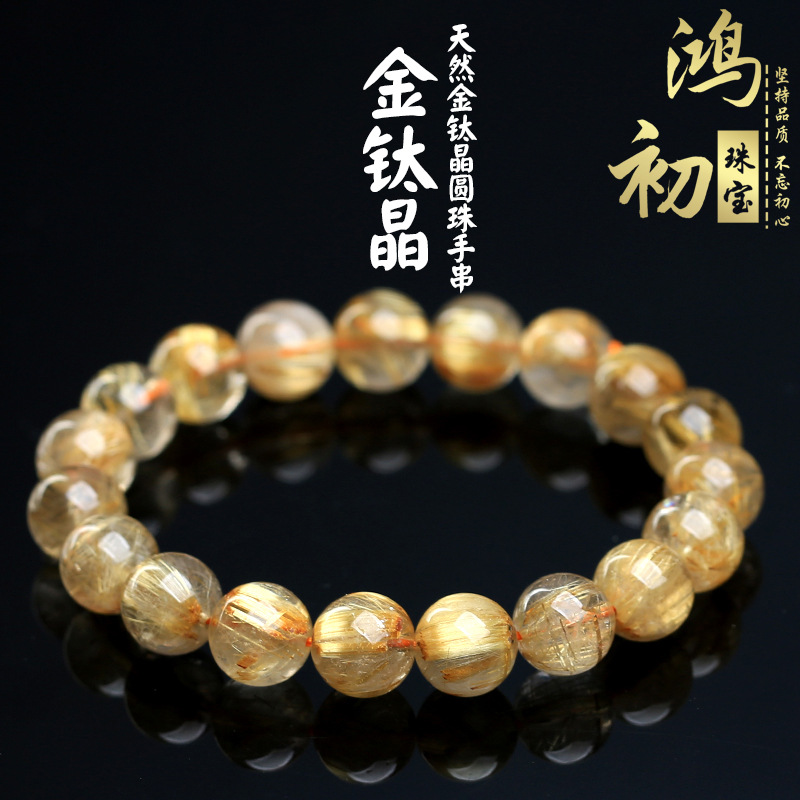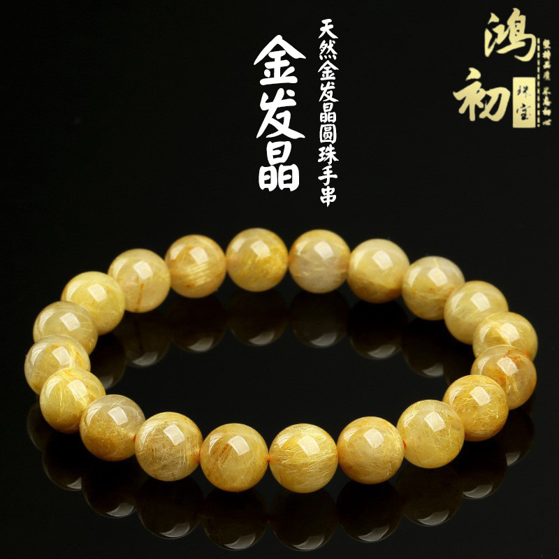 鸿初水晶 天然金钛晶圆珠手串 黄金钛晶冰种粗发款金发晶手链批发